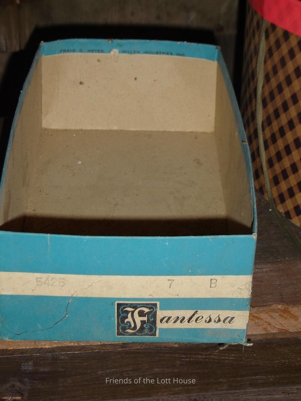 Cardboard shoe box of rectangular shape having Robin's egg blue paper cover and "Fantessa" printed brand nameCollection