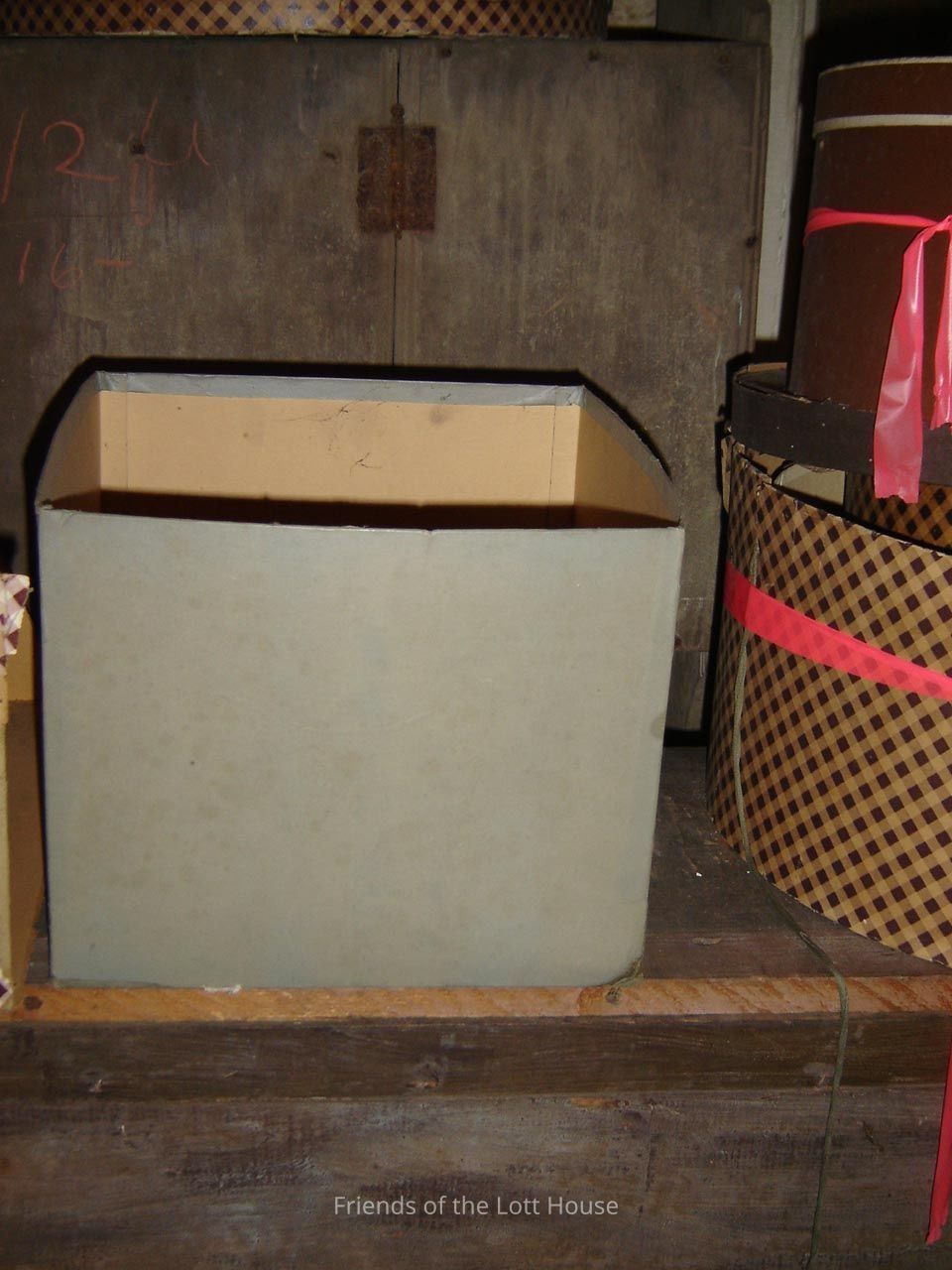 Cardboard hat box, of square shape, having light gray paper coverCollection