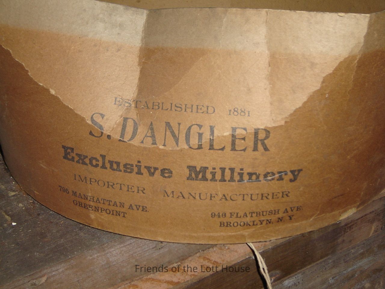 Brown paper hat box of round shape having printed in black letters on the side: "Established 1851/S. Dangler/Exclusive Millinery/Importer Manufacturer/795 Manhattan Ave. Greenpoint/946 Flatbush Ave. Brooklyn, NY"Collection