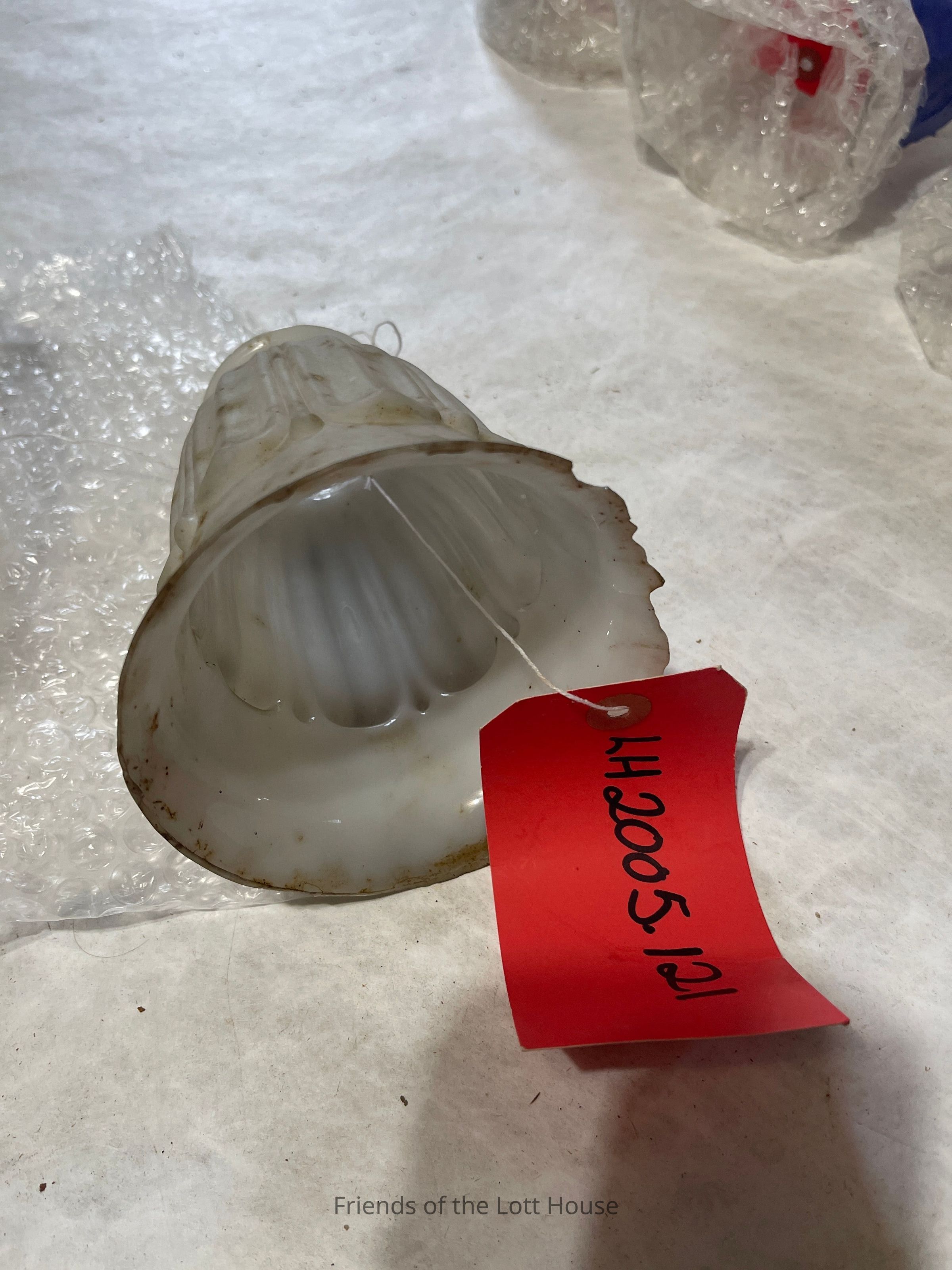 Frosted white shade of elongated bell shape having lambs tongue and dart detail on shoulderCollection