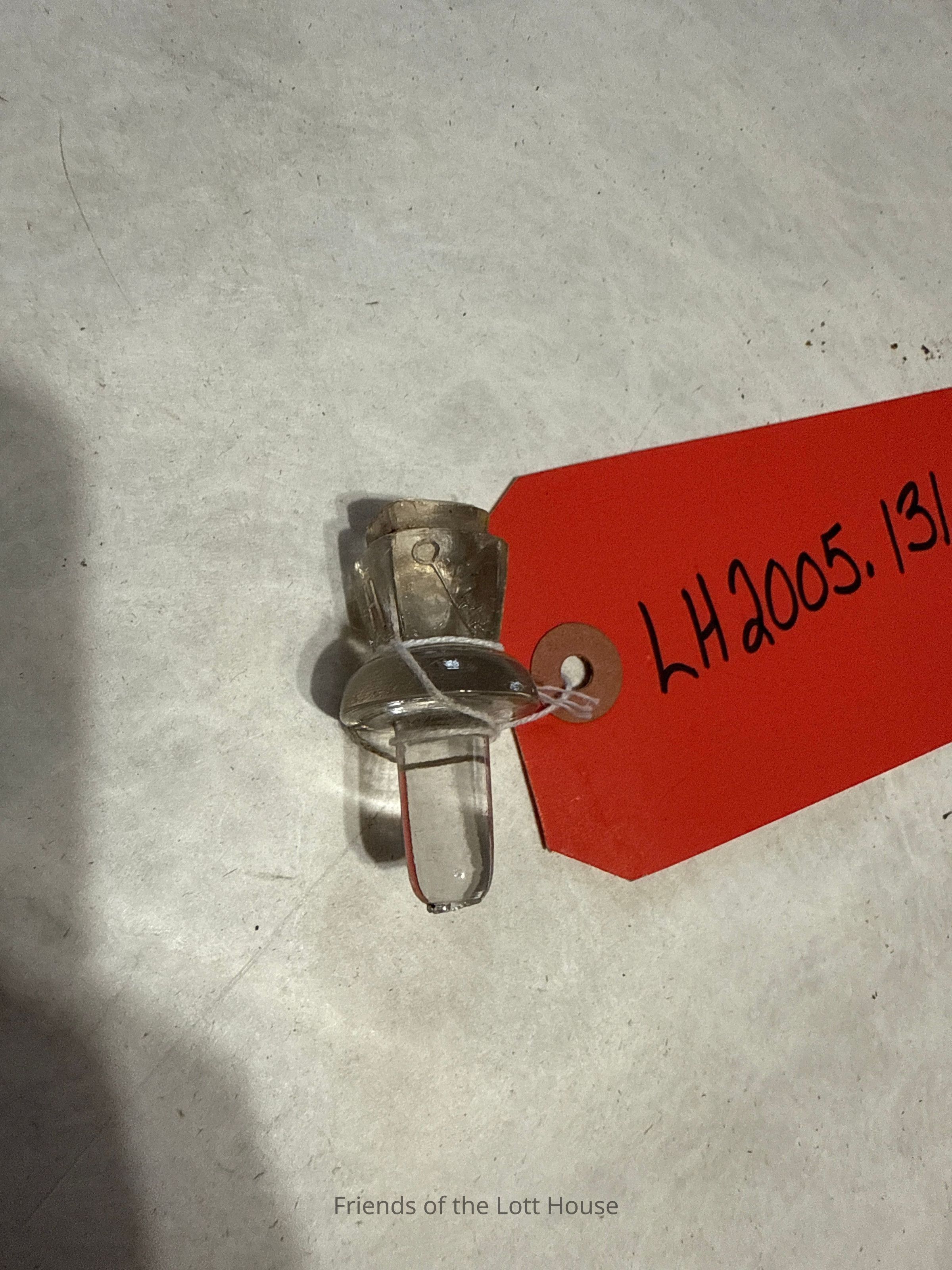 Clear glass bottle stopper of bullet shape having stepped square (keystone) finial. Two sides of stopper embossed "H"; Two sides embossed with a key. From a H J Heinz condiment bottleCollection