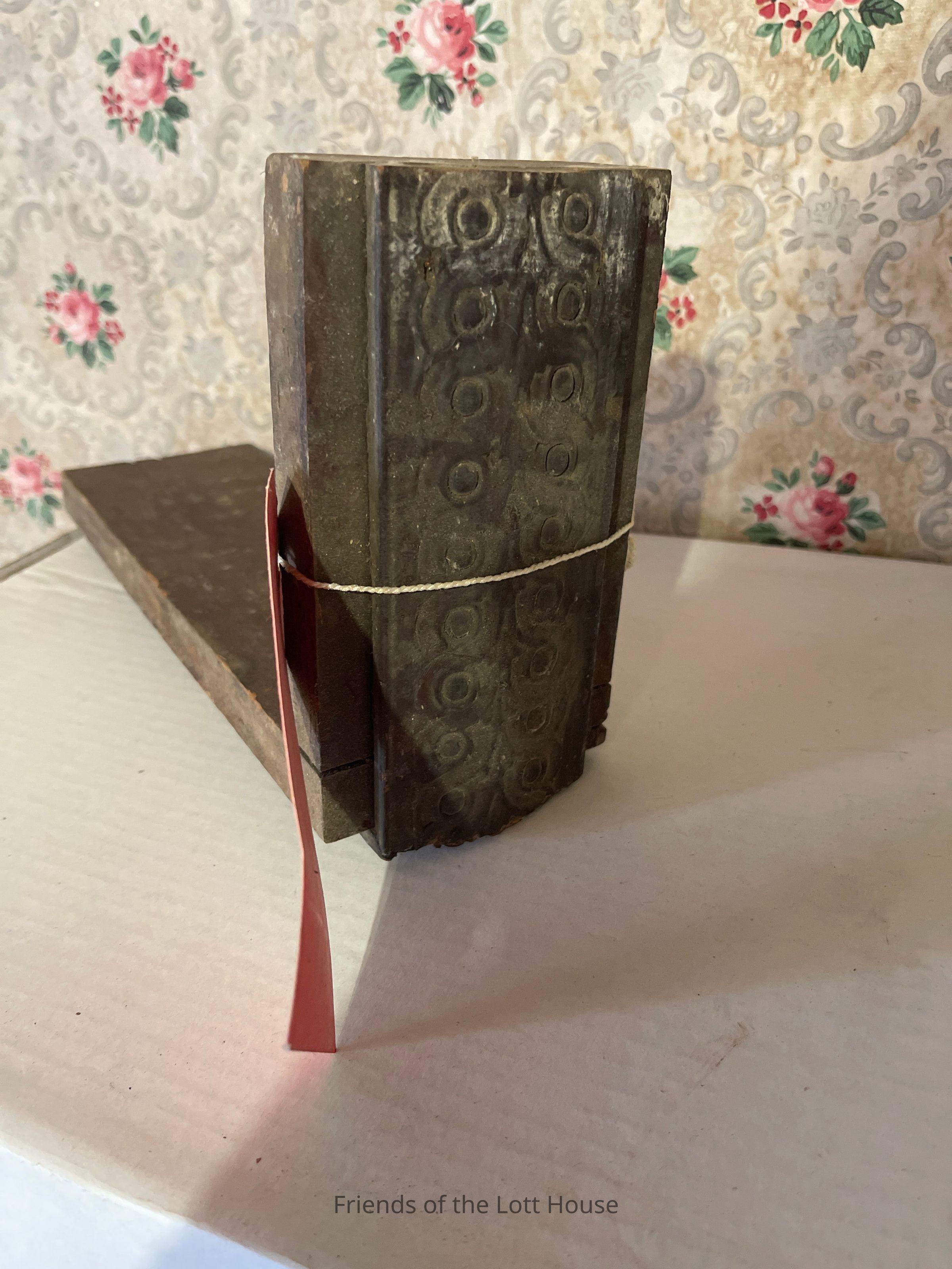 L-shaped carved wood border or molding having a guilloche pattern attached to a plain wood backing similar to LH2005.136Collection