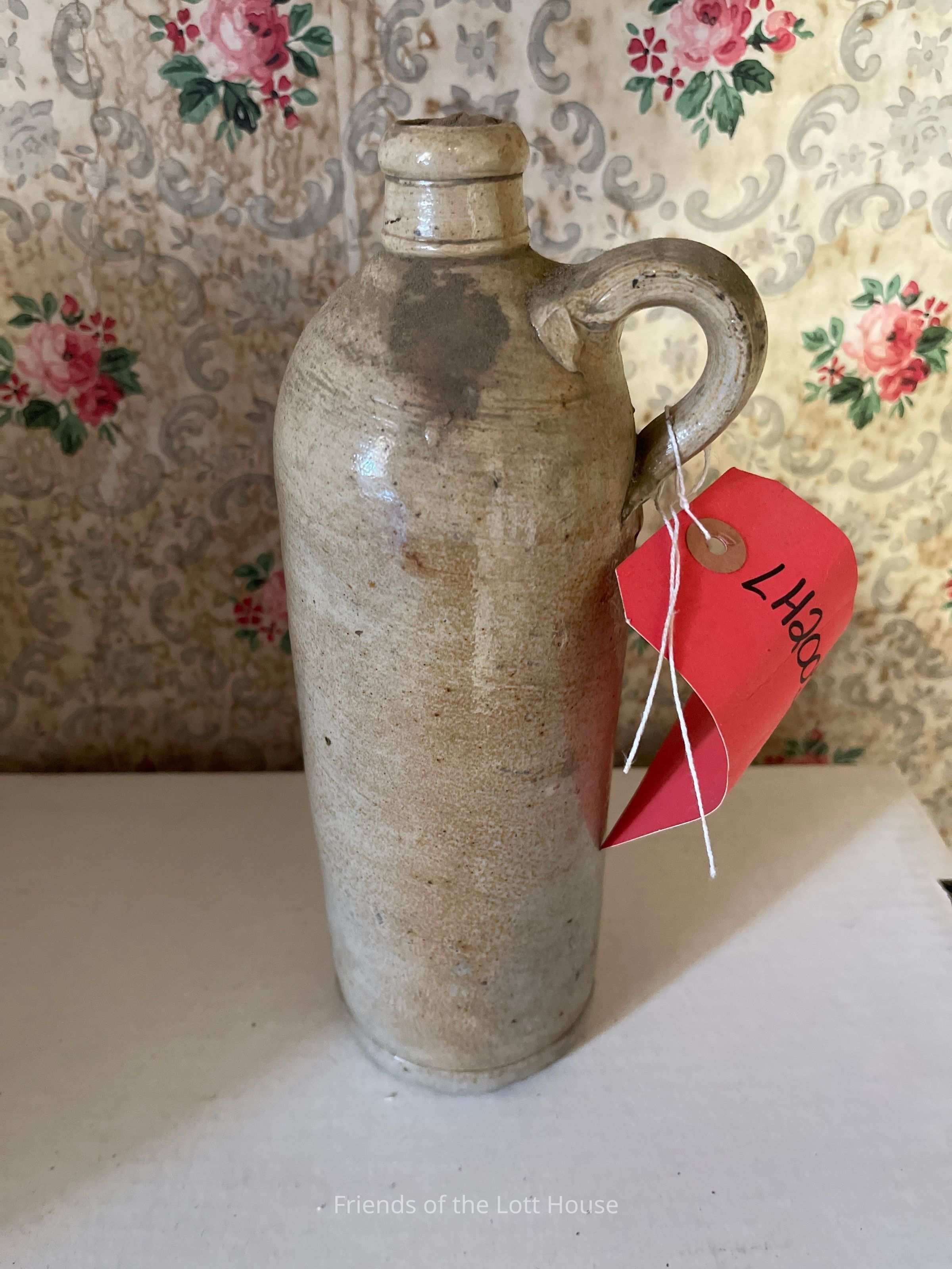 Earthenware jug of tall cylindrical shape having applied handle at neck and light grey glaze; with stopper in neckCollection