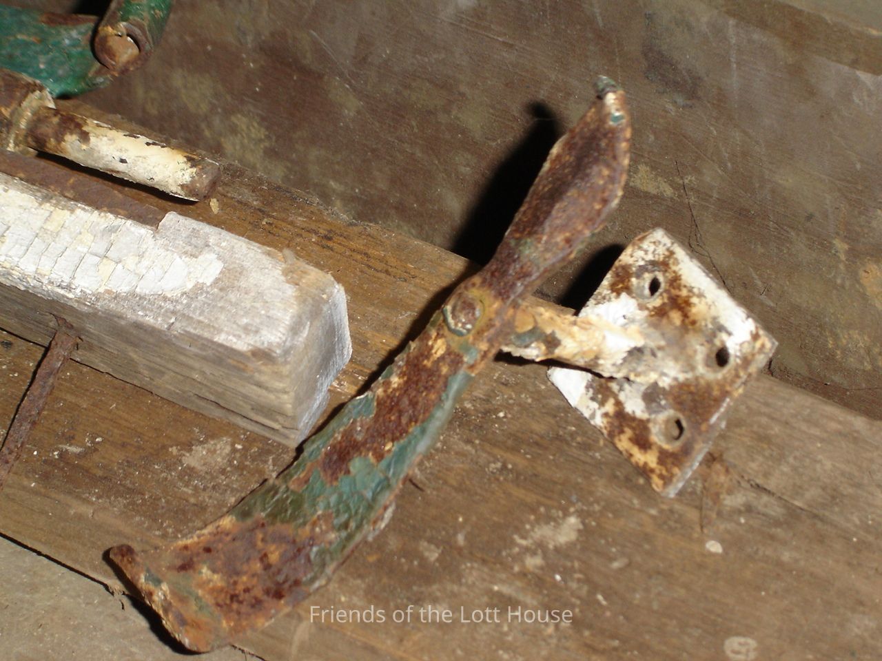 Iron shutterdog comprising a flattened bar having opposing pointed and squared ends fixed to post and plate having screw holes; used to hold exterior shutters open on the exterior of a buildingCollection