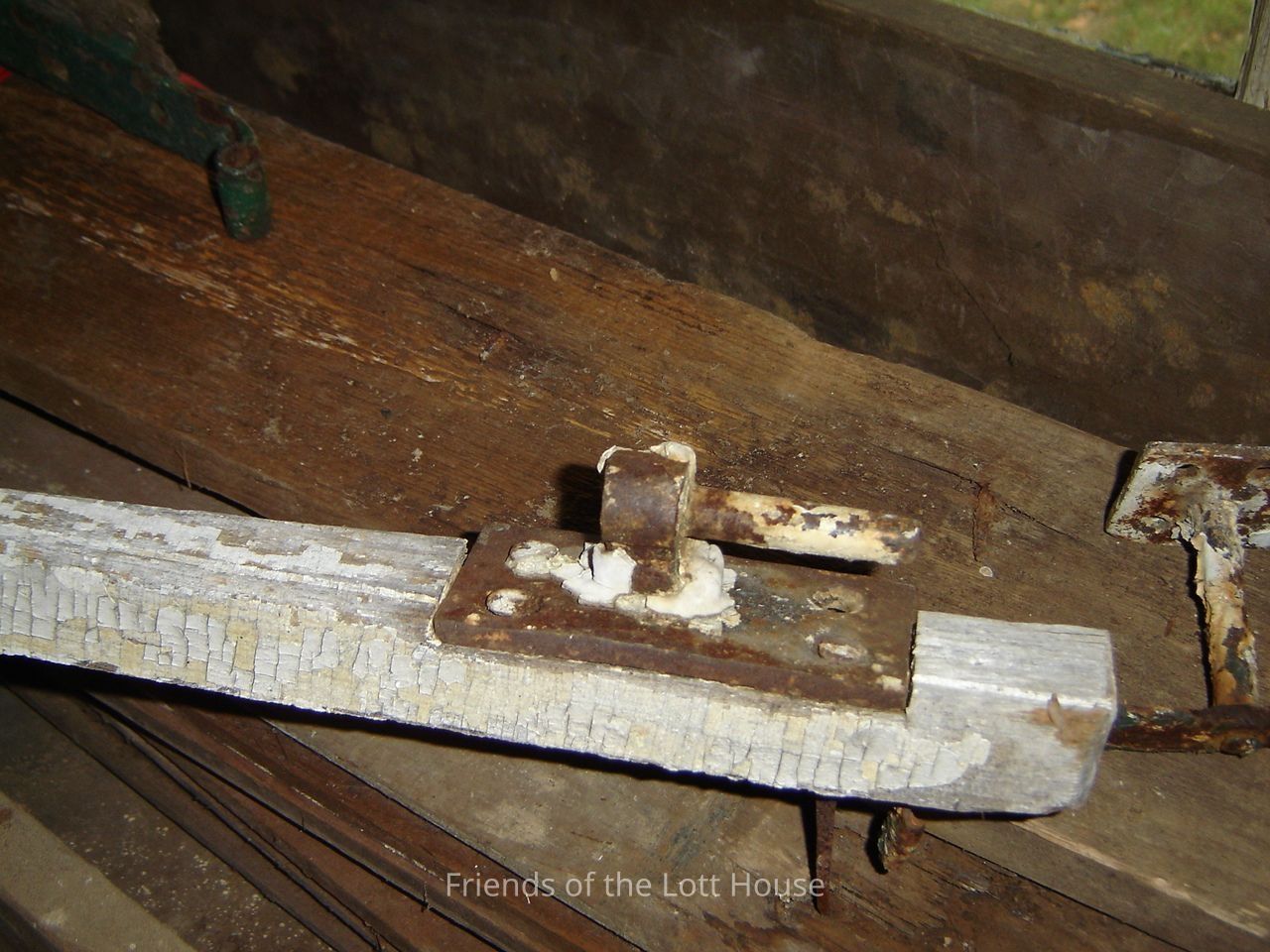 Forged iron blunt ended pin fixed at parallel position to plate attached to wood fragment having remnants of white paint; used as pivot for shuttersCollection