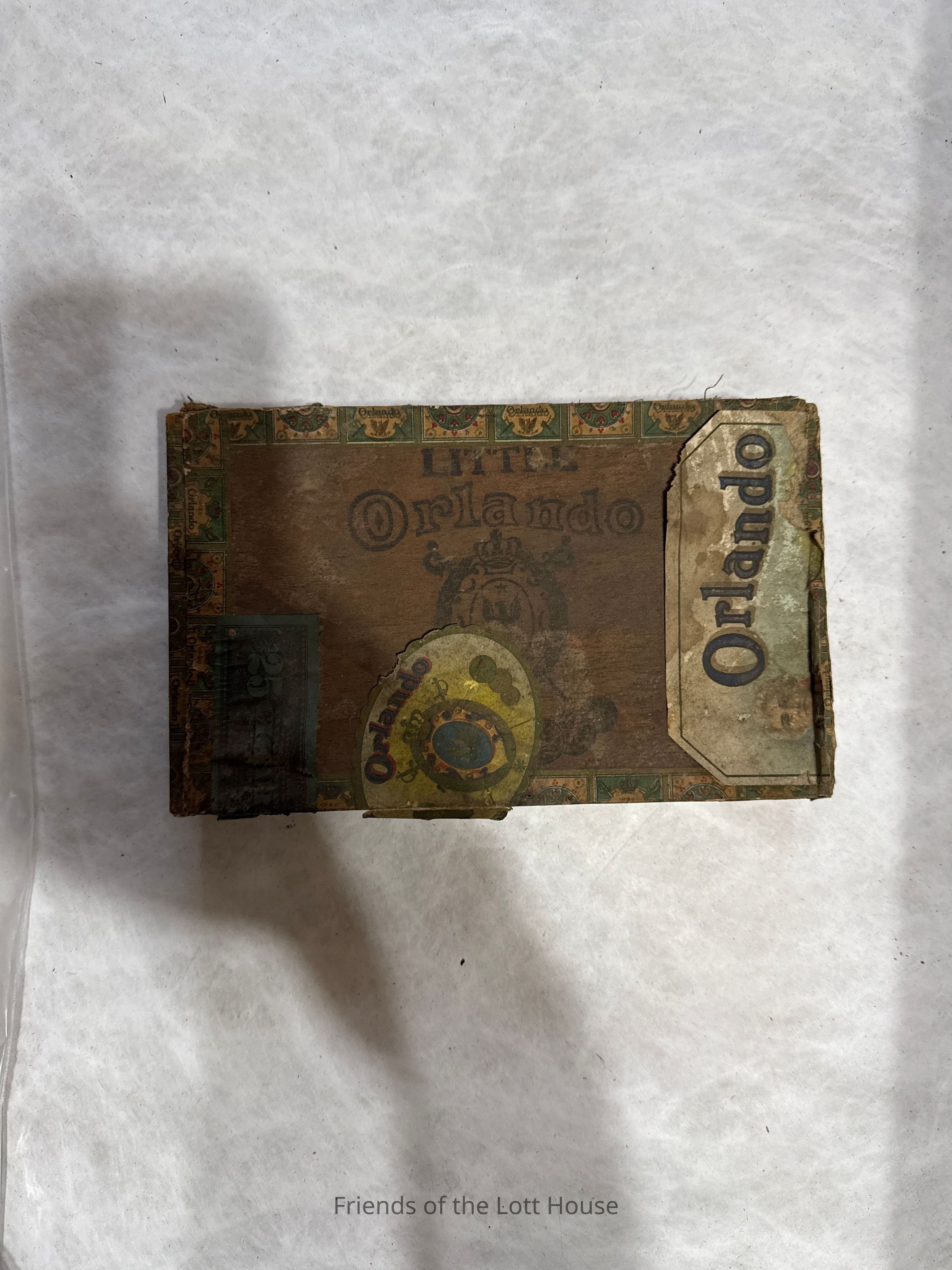 One of two objects housed in plastic bag; paper covered wood cigar box (.1) having the brand name, Orlando and iron bracket (.2) having arch shaped braceCollection