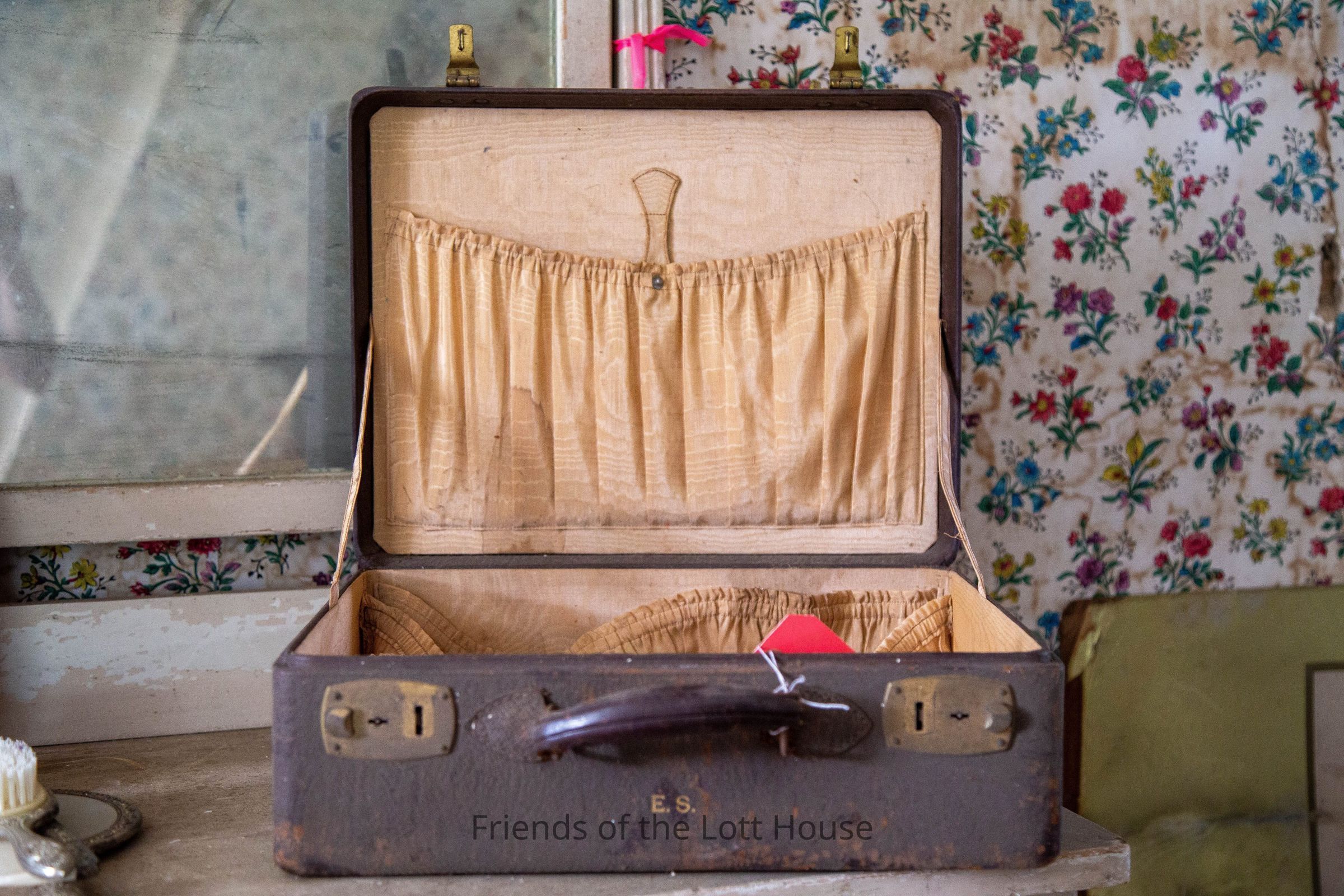 Leather covered suitcase, of square shape, having hinged lid with two front metal closures and leather handle; the interior is lined with cream colored fabric and fitted with ruffled storage pockets. Stamped E.S.Collection