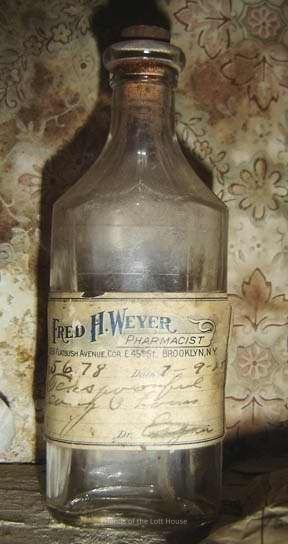 Clear glass apothecary bottle with cork in neck having paper label: Fred H. Weyer, Pharmacist, 2161 Flatbush Avenue Brooklyn N.Y. (with handwritten instructions for administering)Collection