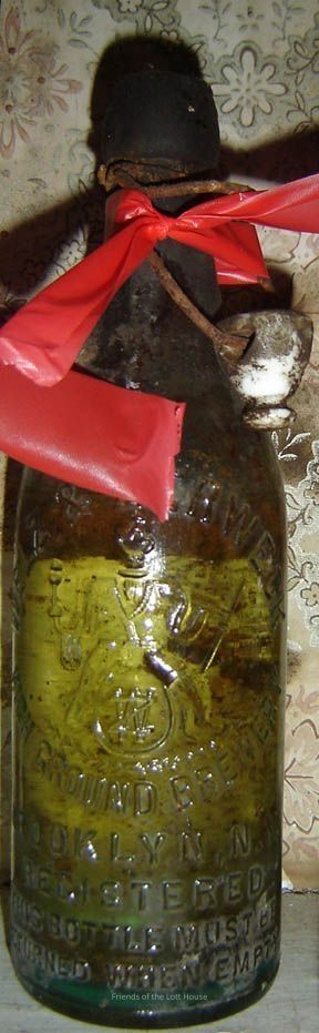 Green glass bottle of cylindrical shape having round shoulder and tapered neck fitted with wire closure and stopper the side bearing the molded imprint: WELZ & ZERWECK BREWERY (with coat of arms)Collection
