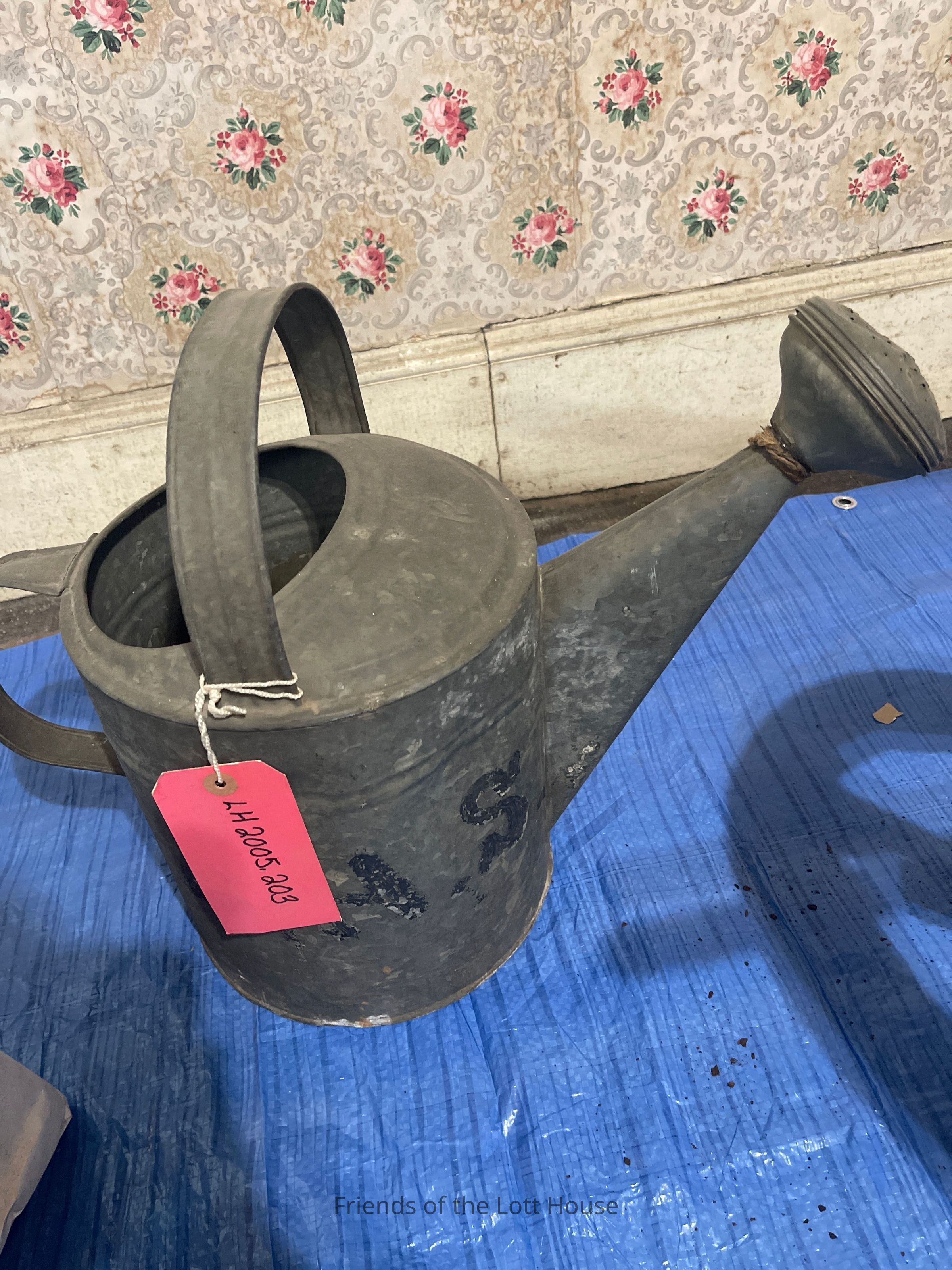 Galvanized metal watering can of cylindrical shape having strap handles on side and top, angular spout, and the initials A H S in black letters printed on the sideCollection