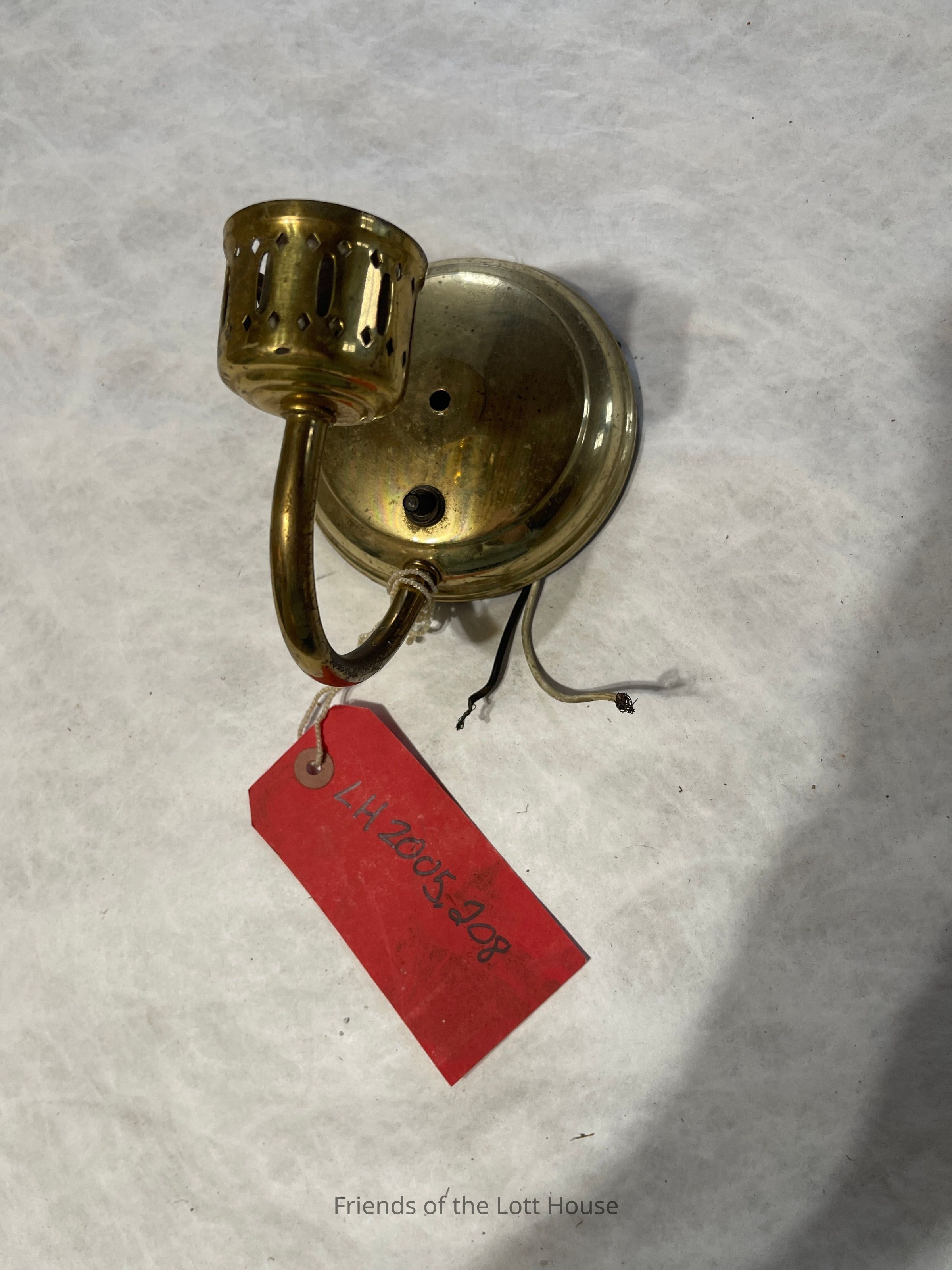 Patinated metal sconce having raised, round wall plate having U-shaped socket arm and pierced candle cup fitted with electrical socket.Collection