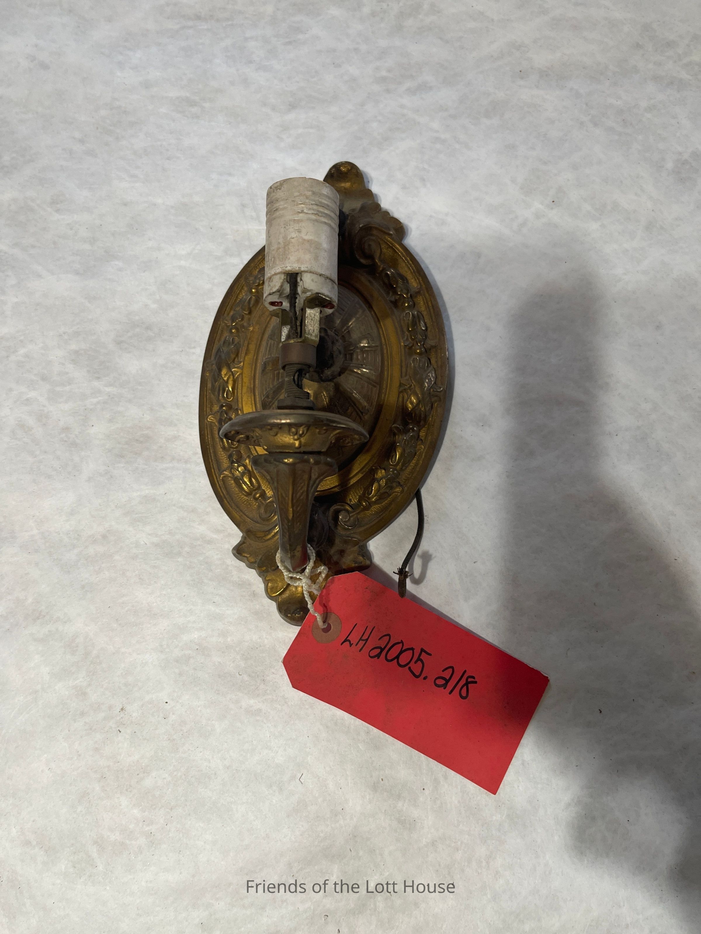 Patinated metal sconce having raised oval wall plate decorated with scroll, acanthus and bellflower garland, U-shaped candle arm and cylindrical plastic electric socket, cloth wiringCollection