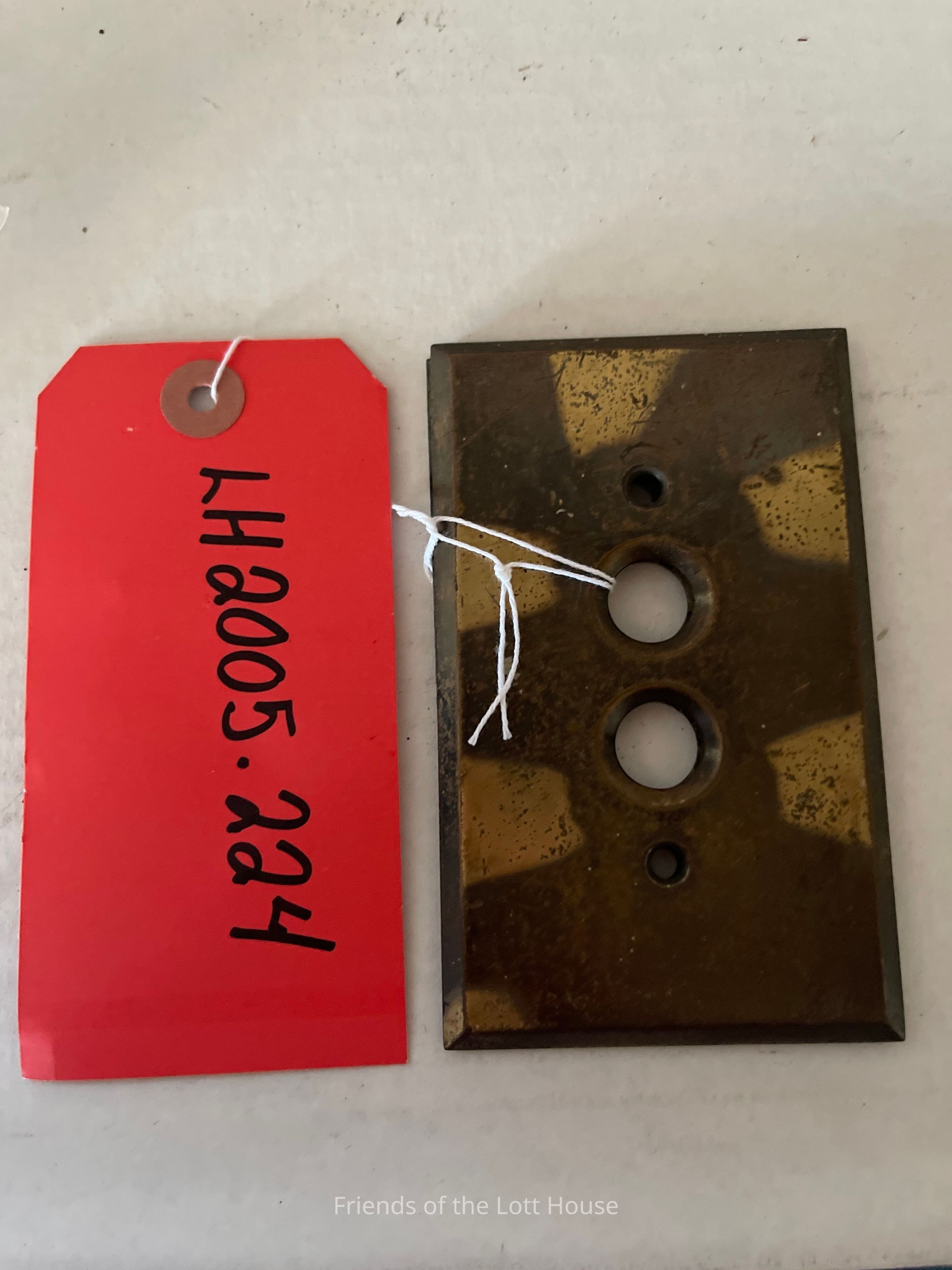 Patinated metal coverplate, one of two of same, of rectangular in shape having punched holes for screws and switch buttons. For light switch.Collection