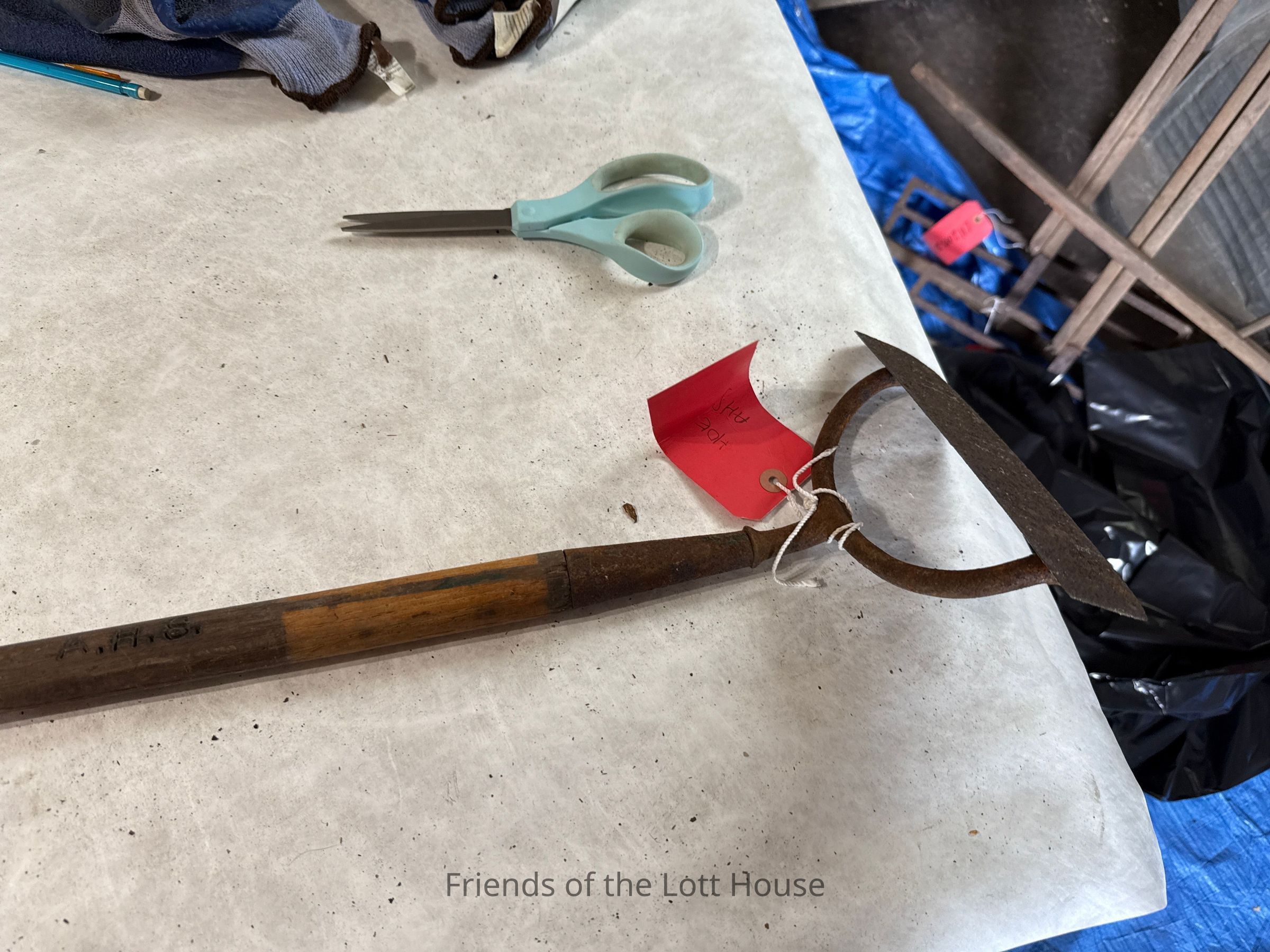 Turned wood pole fitted at one end with a rectangular metal plate set on an angle; the initials "A.H.S." carved into handleCollection