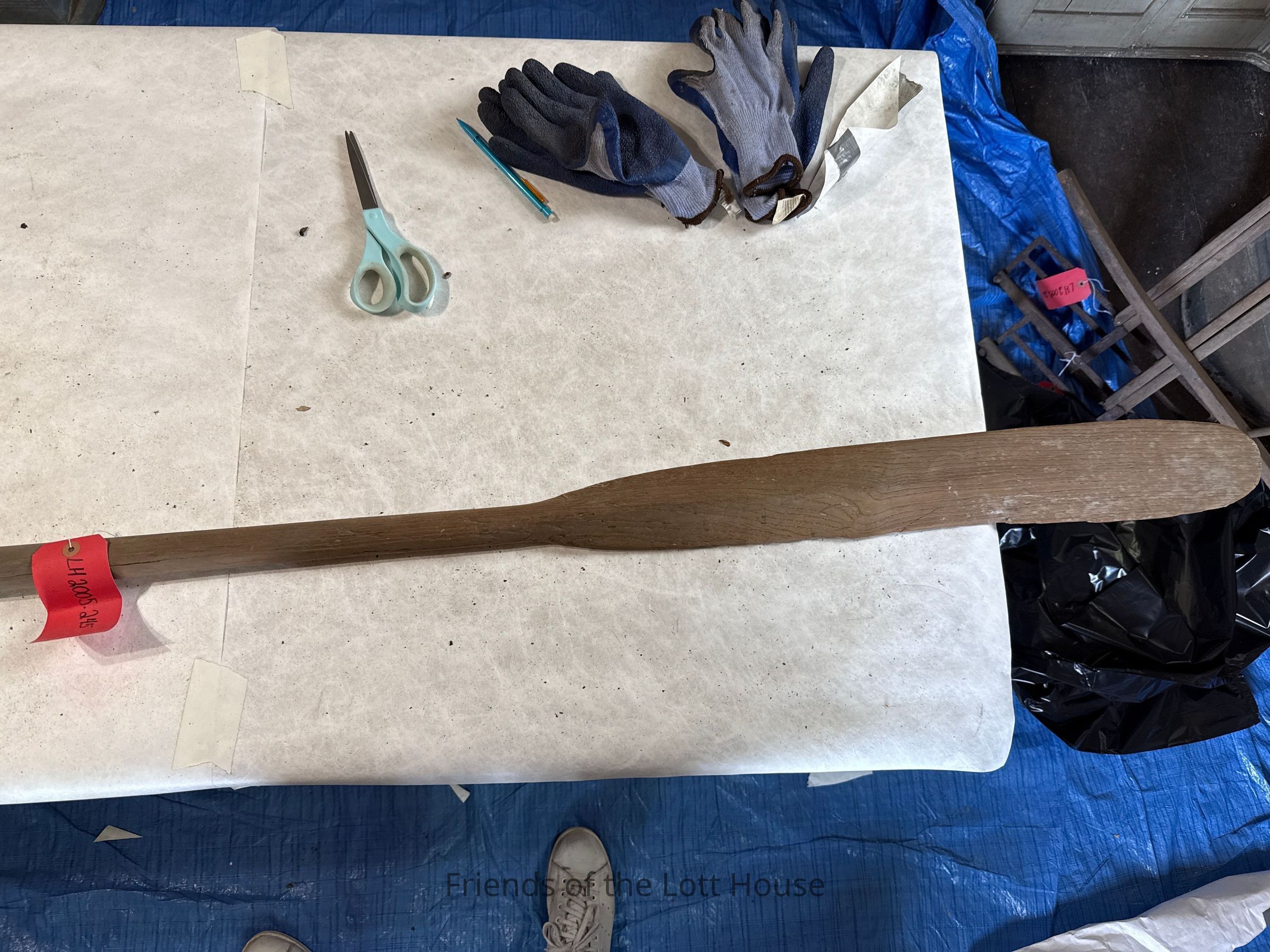 Wood oar having turned shaft with rolling pin end and round tipped paddle, "E.P. Page/S.H.B." carved into oarCollection