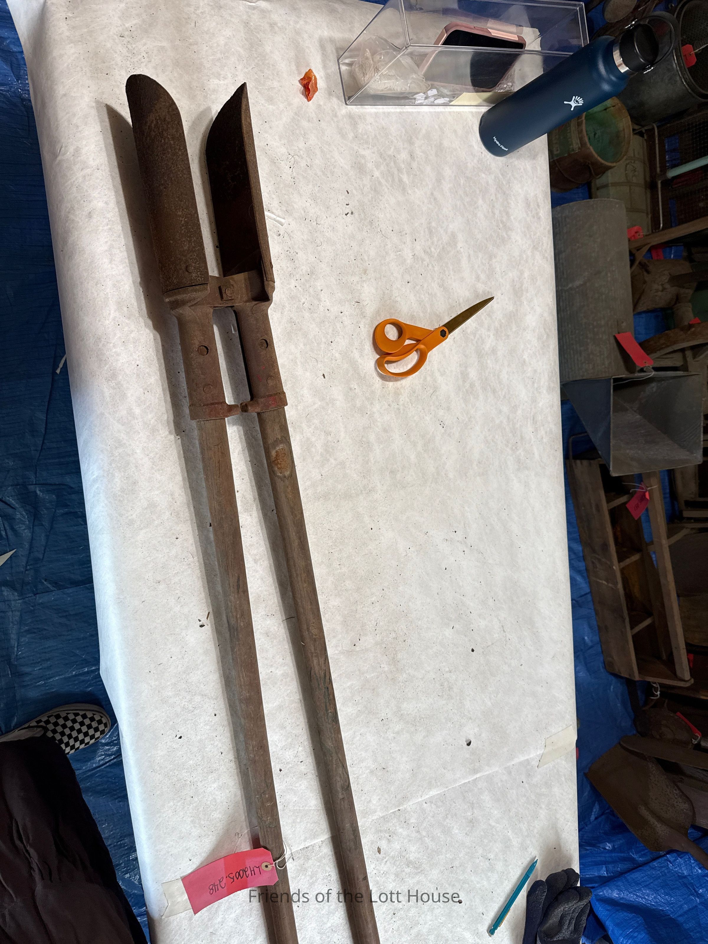 Post hole digger, the turned wood pole fitted with two hinged curved bladesCollection