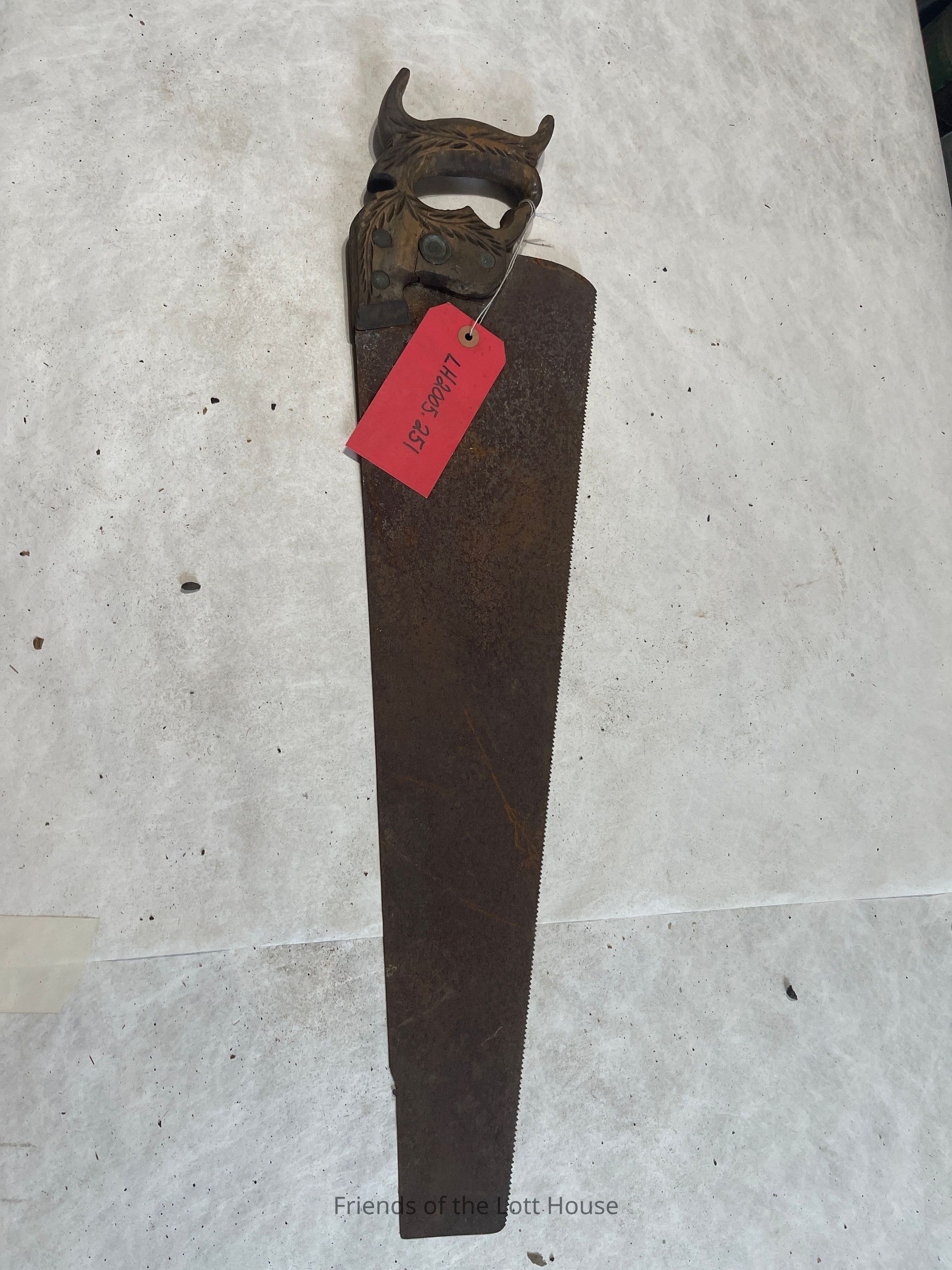 Hand saw having carved wooden handle with wheat design and tapering fine-toothed bladeCollection