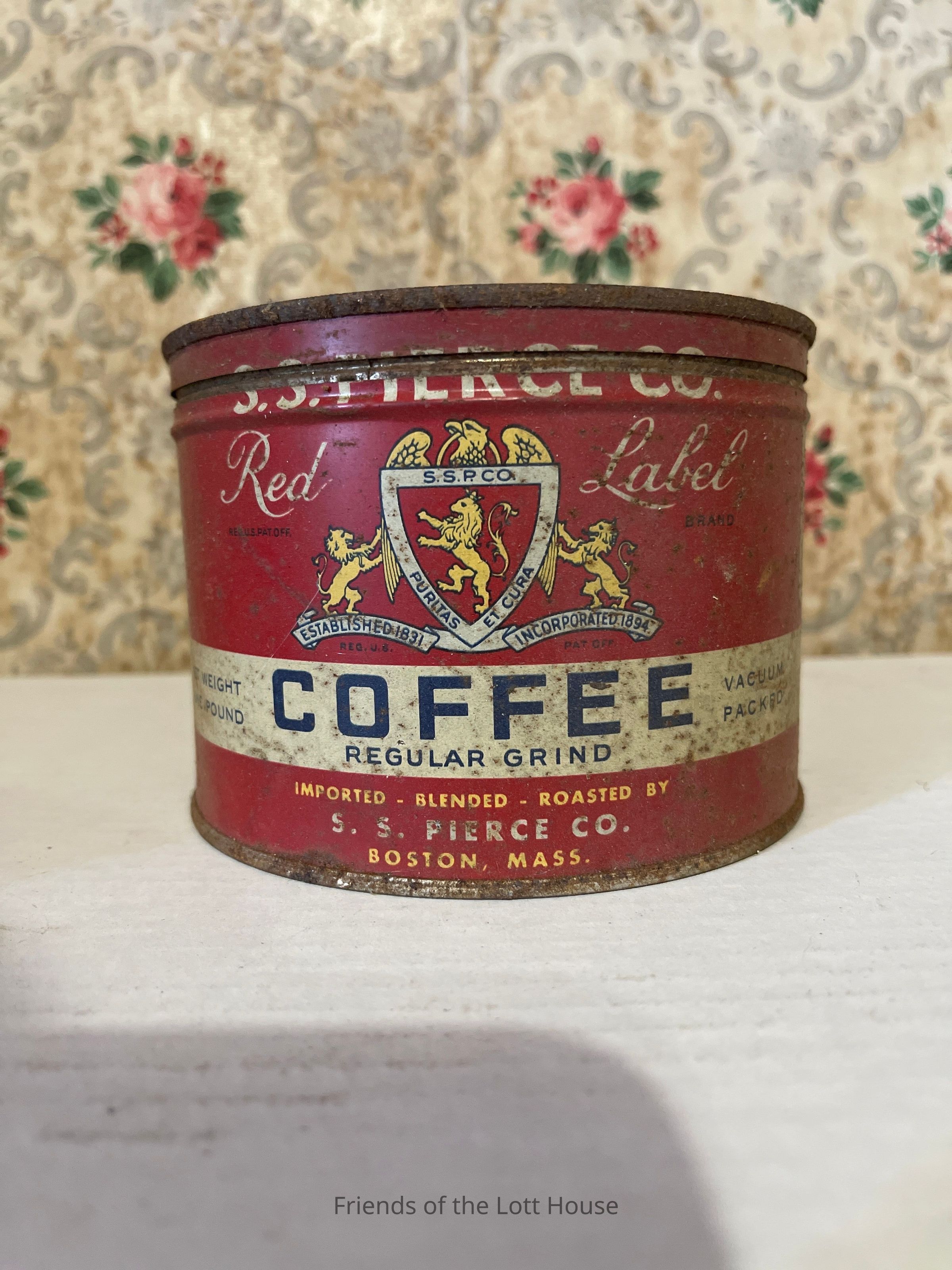 Metal can of round shape with form fitting lid, decorated with a red background having blue and yellow label indicating use for coffee. Label: S.S. Pierce Coffee Co.Collection