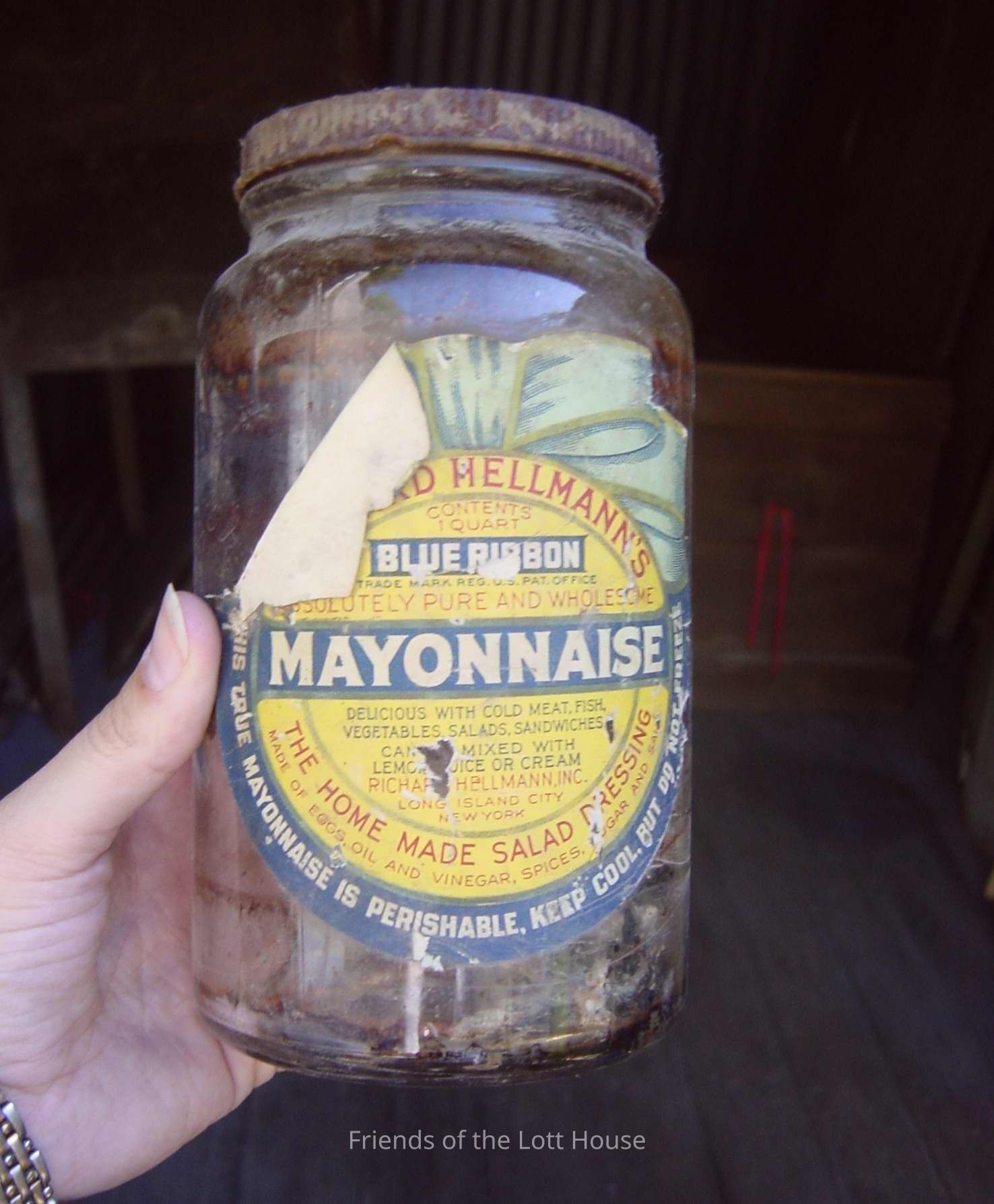 Clear glass jar of cylindrical shape having wide mouth with metal screw lid having paper label with blue and yellow writing and design, indicating use for Hellman's mayonnaiseCollection