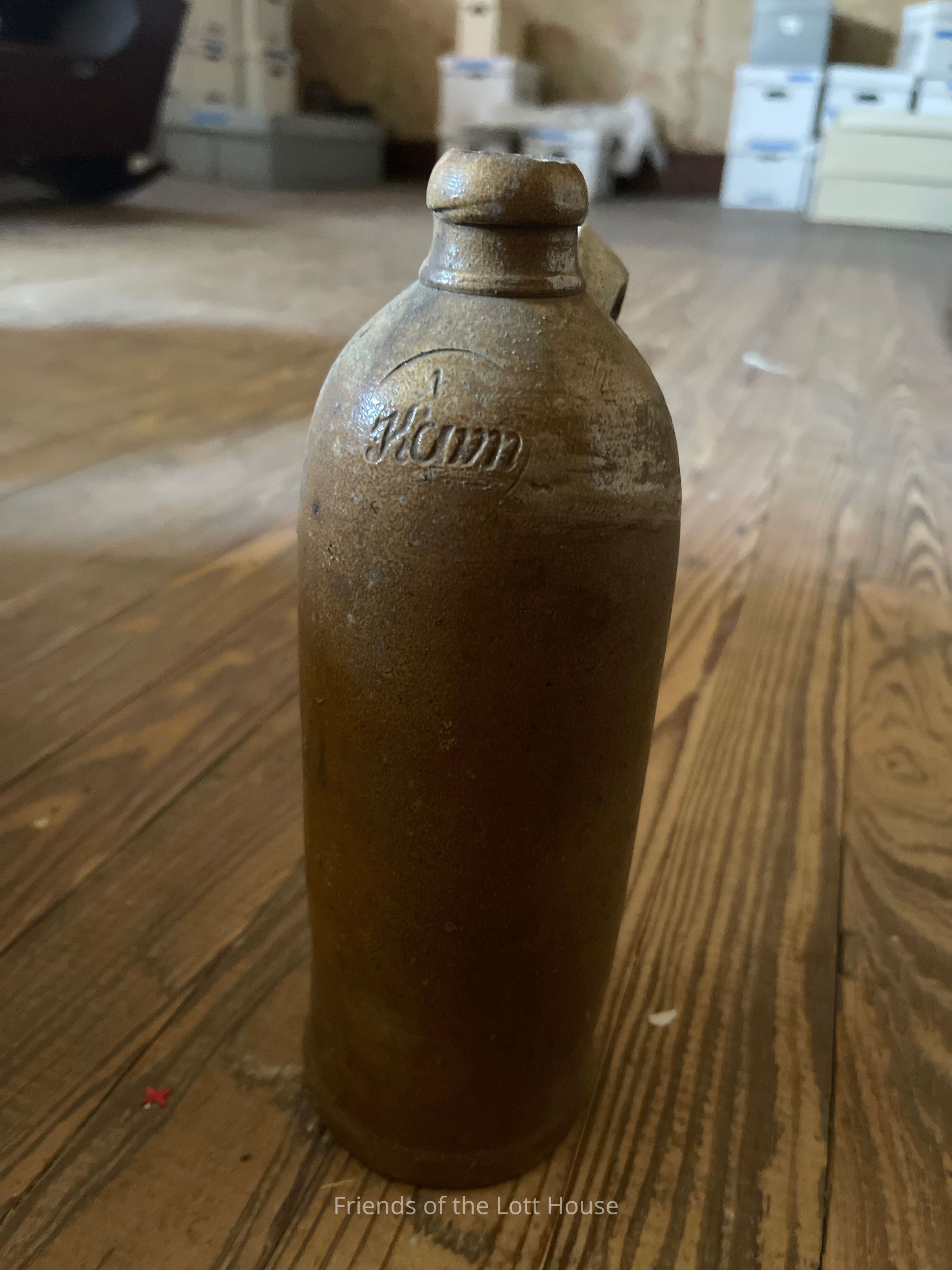 Earthenware jug of narrow cylindrical shape having loop handle at neck, decorated with brown slip having "Hann" stamped into clay on side of bodyCollection