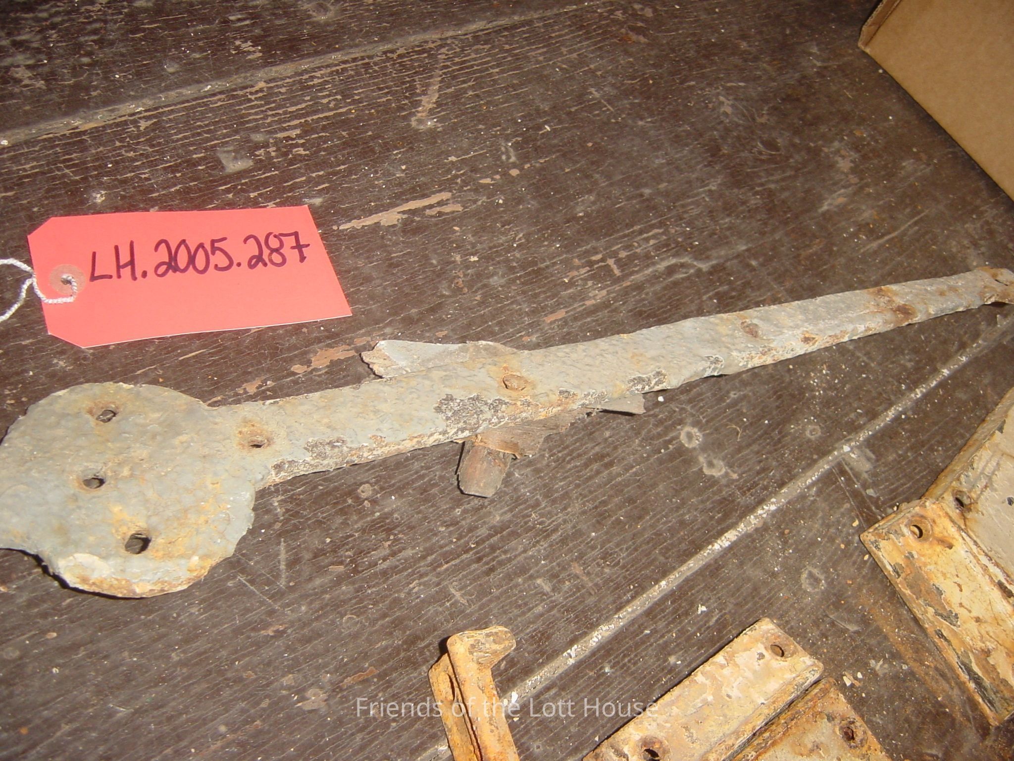 Iron strap hinge of tapered shape having opposing loop and hole ends with round plate at loop end; wood fragment remains nailed to hingeCollection