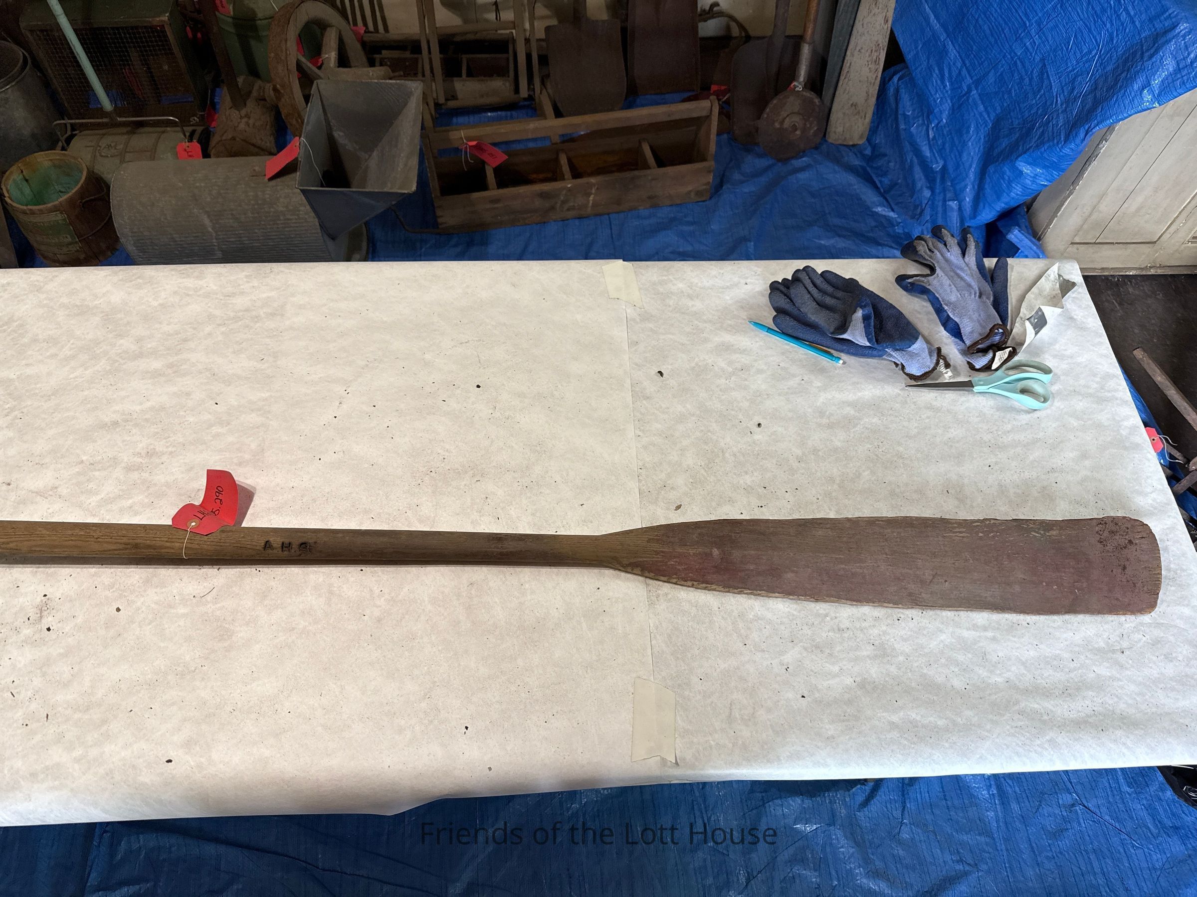 Wood oar having turned shaft and flat topped paddle; with "A.H.S." carved into oar and remnants of red paintCollection