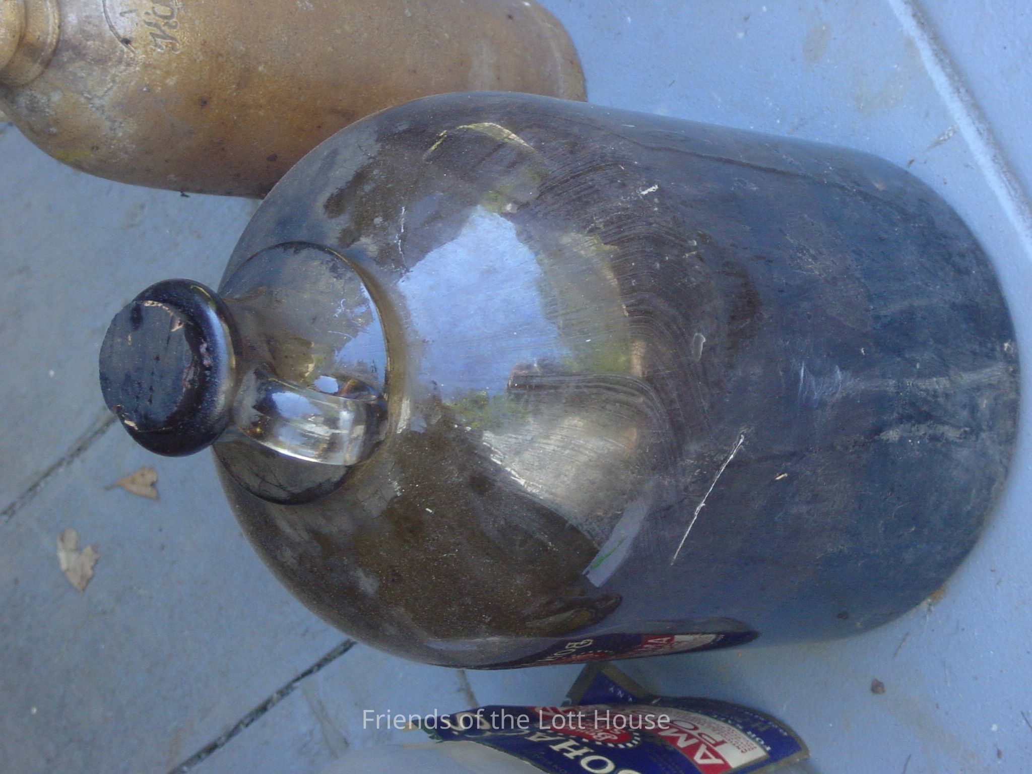 Amber colored glass jug having cylindrical body, clear glass handle, shaped neck and cork stopperCollection