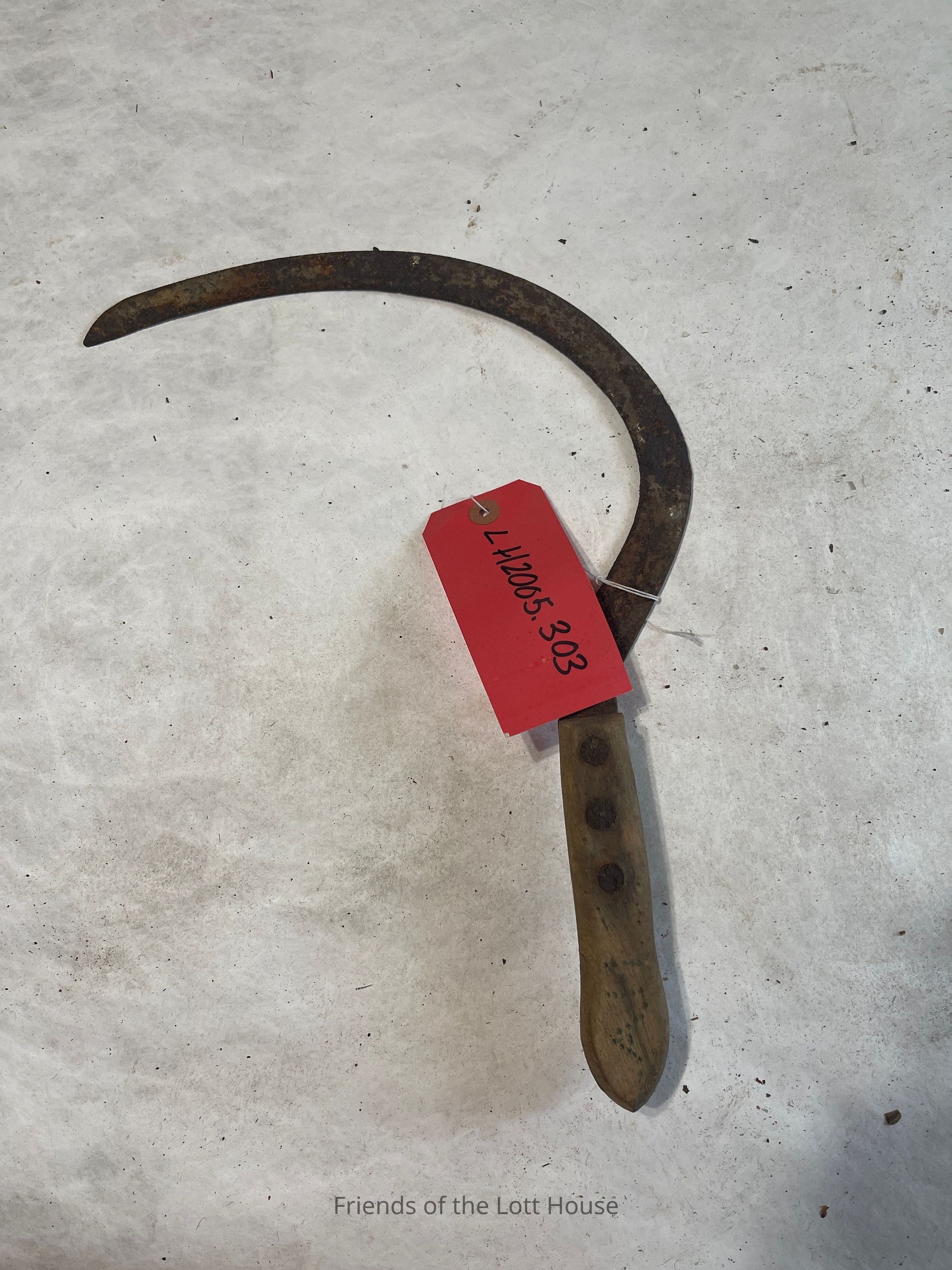 Iron sickle having curved blade and turned wood handle having the pattern of initials AHS drilled into surfaceCollection