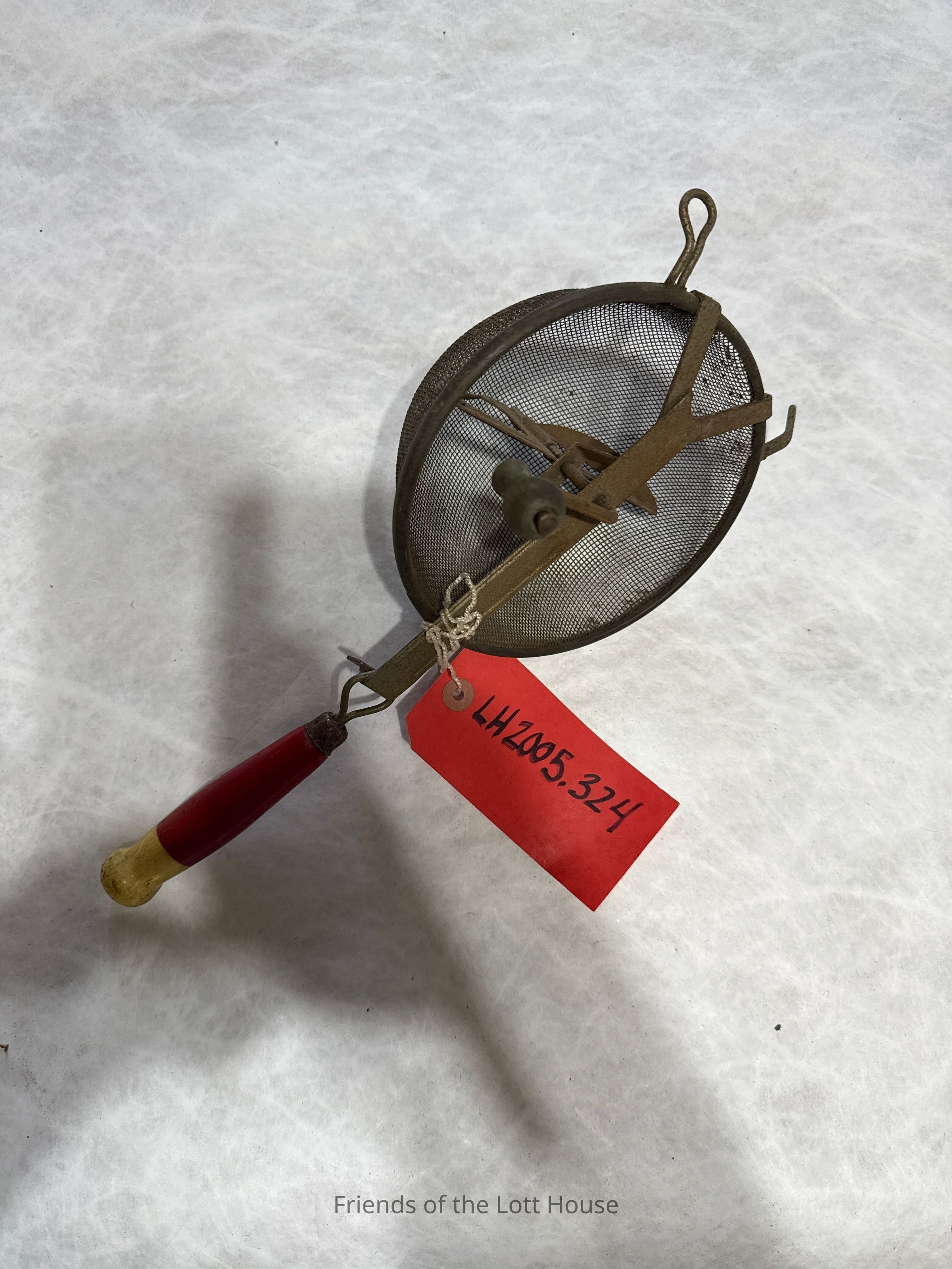 Metal sifter having mesh basket with tabs for resting on bowl, attached to red painted handle fitted with metal pattle and turning mechanismCategory