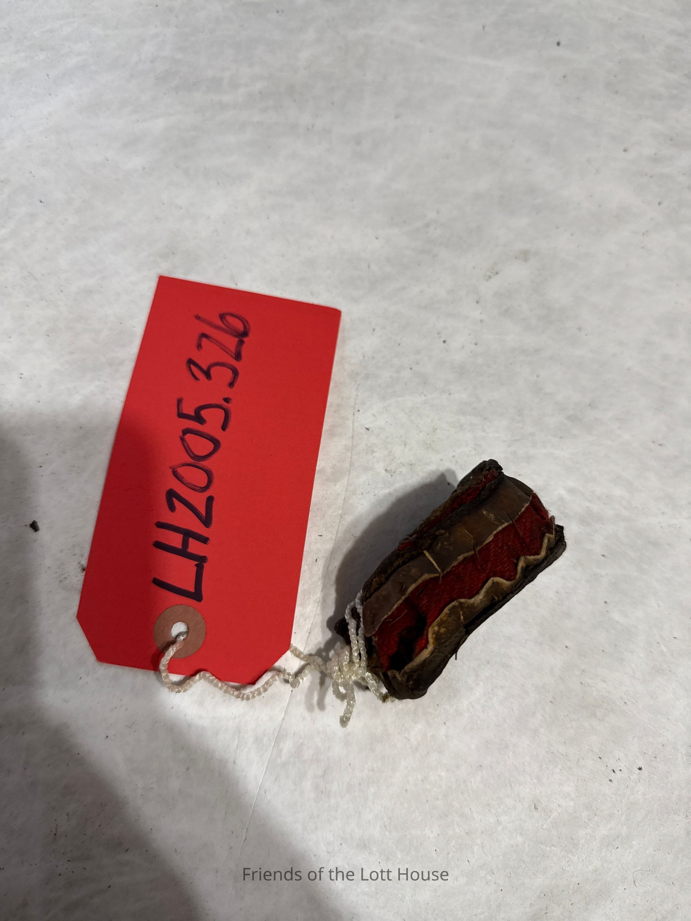 Leather strap (curled in circle) having red fabric padding.Collection