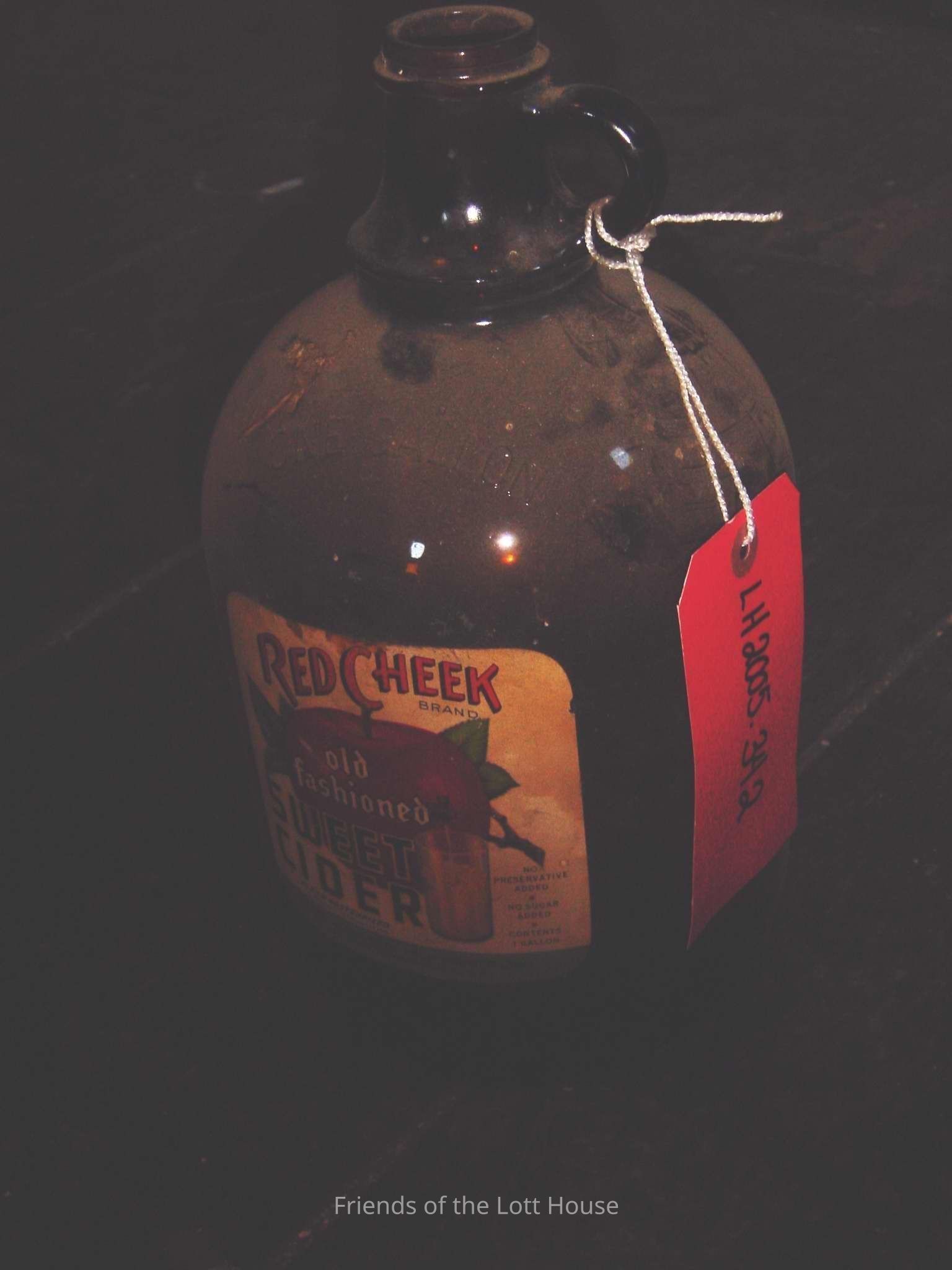 Amber colored glass jug of cylindrical form having short narrow neck with loop handle with paper label: Red Cheek Sweet CiderCollection