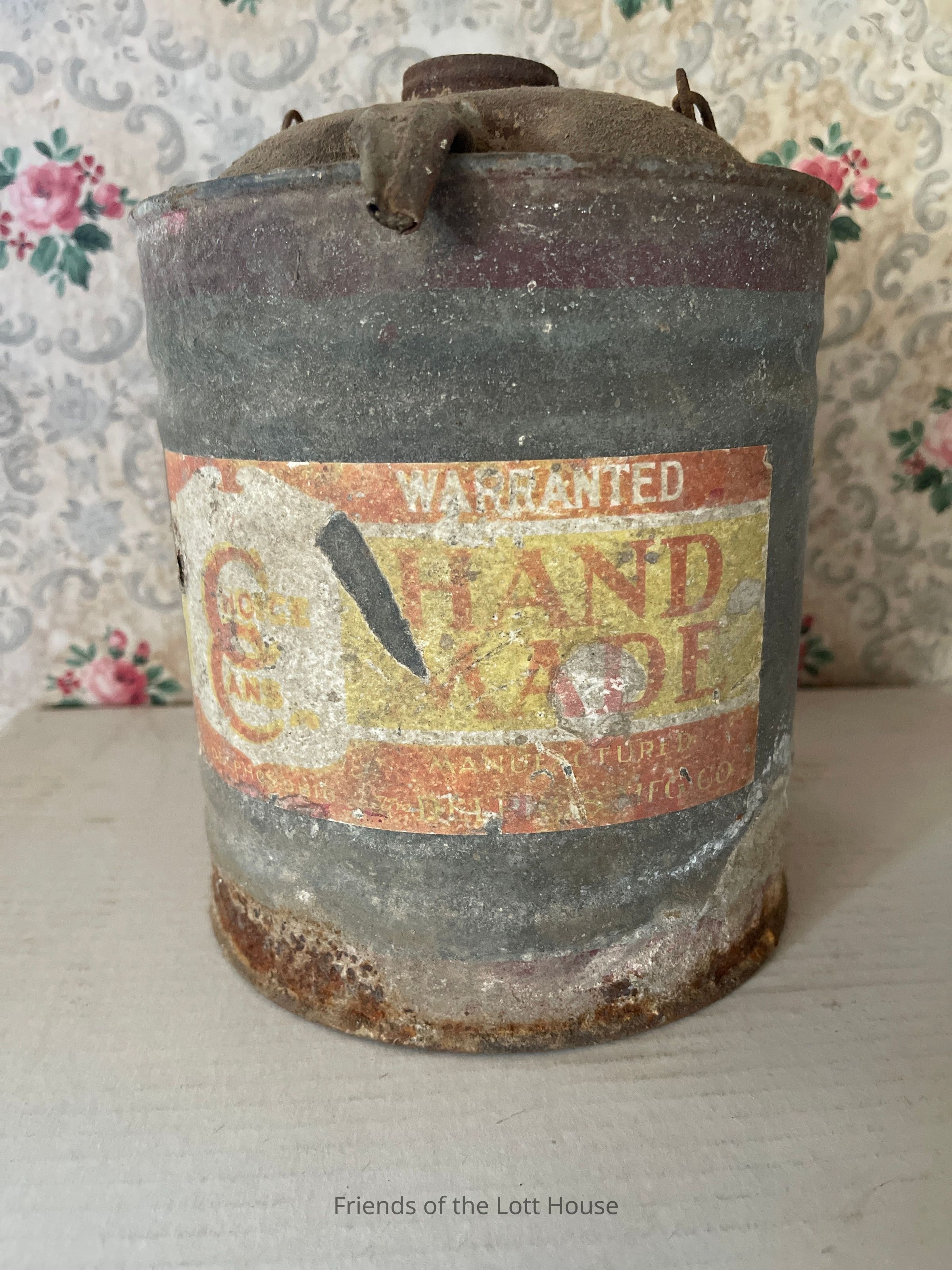 Galvanized metal can of cylindrical shape having loop handle with wood grasp and spout. Paper label - "Choice Cans / Hand Made"; "Warranted"; "Manufatured Delphos Mfg Co"Collection