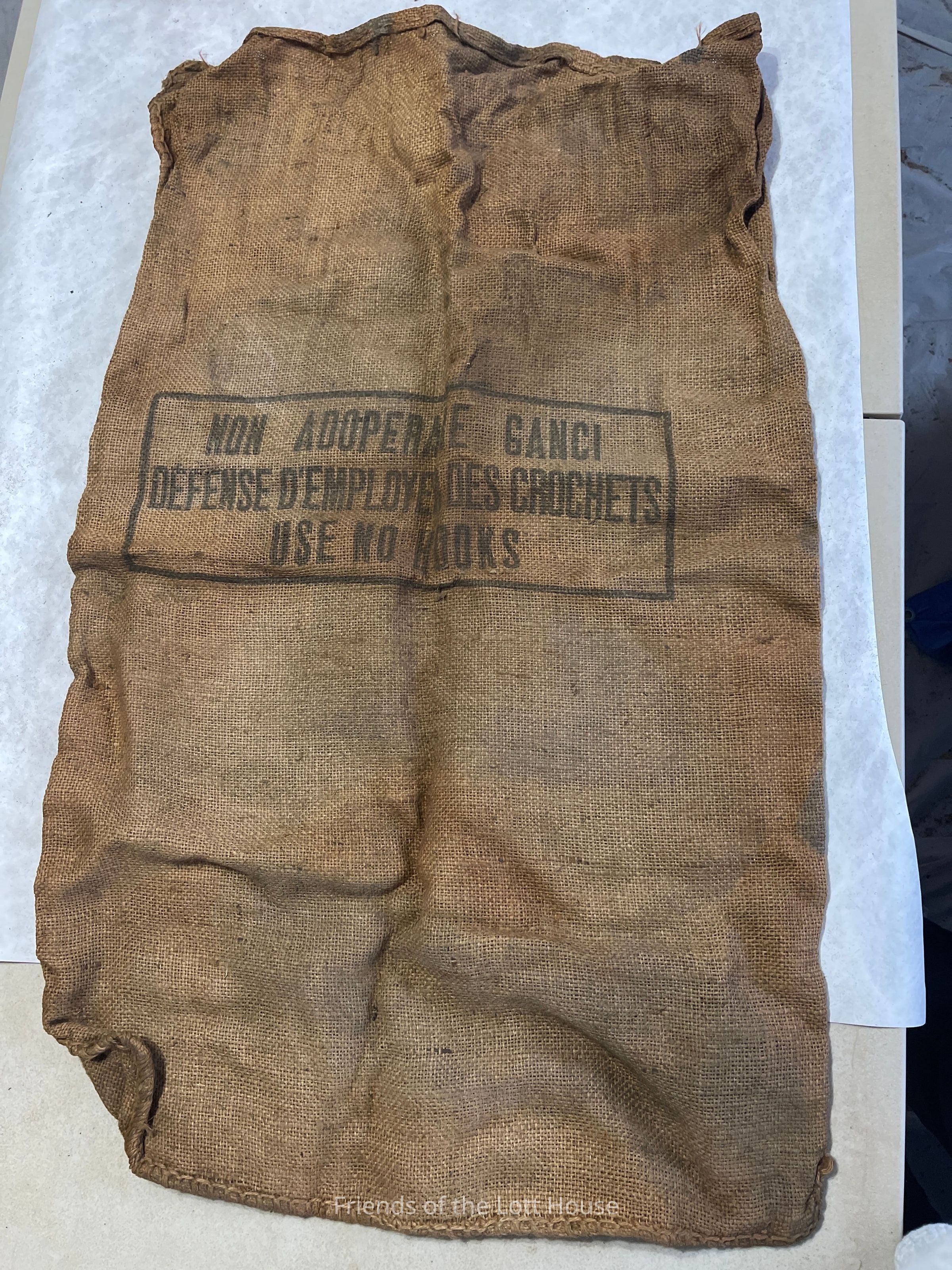 Burlap sack of rectangular shape having stamped lettering: New York Made in [?] and on reverse in English, French and Italian, USE NO HOOKSCollection