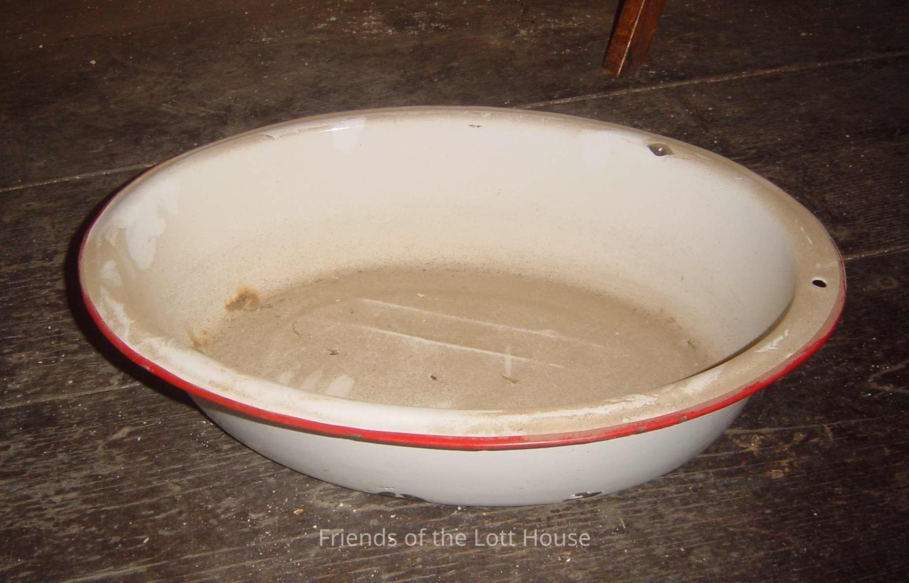White enamel basin of oval shape decorated with red stripe on rimCollection