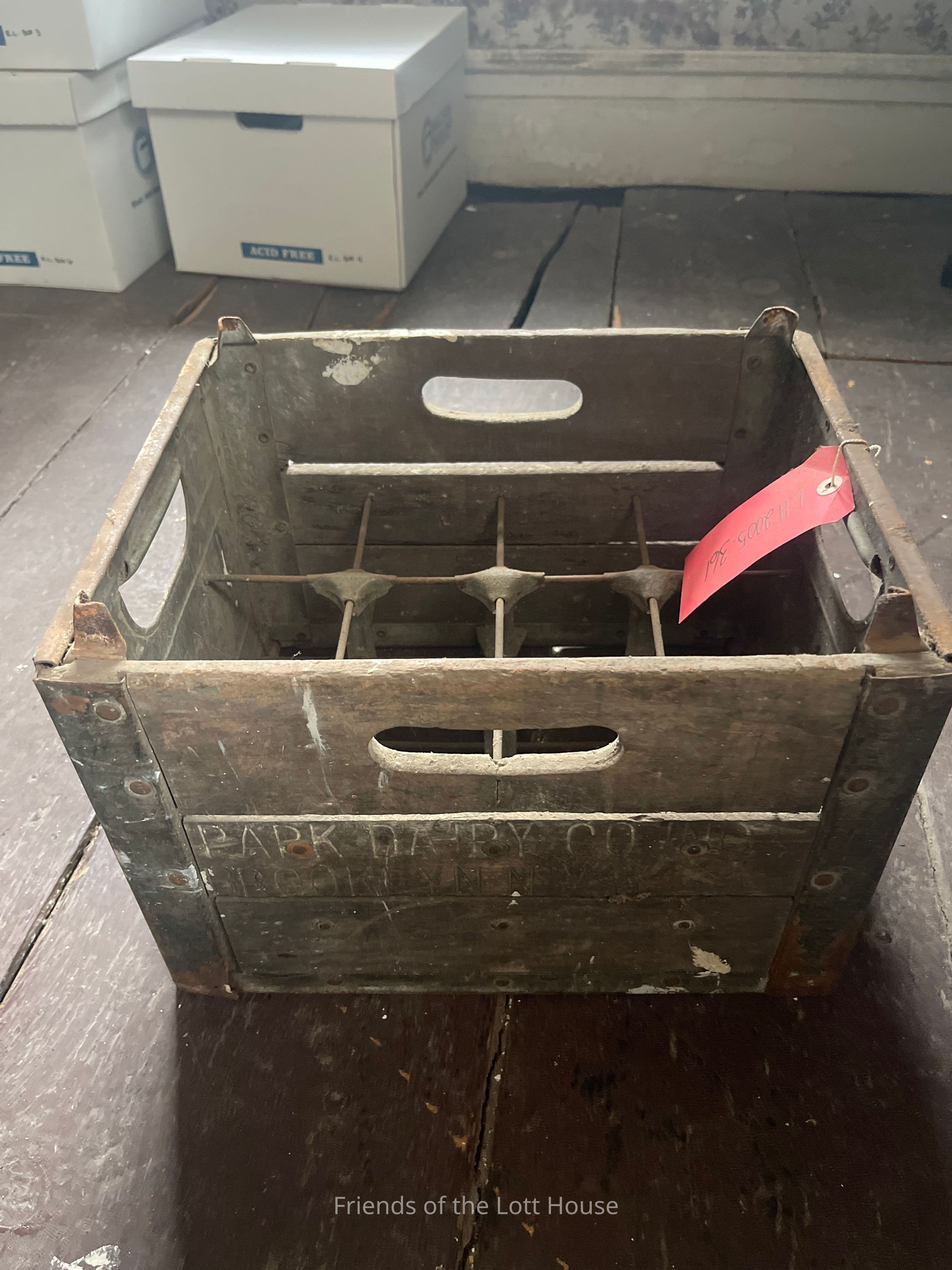 Galvanized metal and wood milk crate labeled on both long sides: Park Dairy Co Inc/Brooklyn NY 8-54; on both short sides: Park/DairyCollection