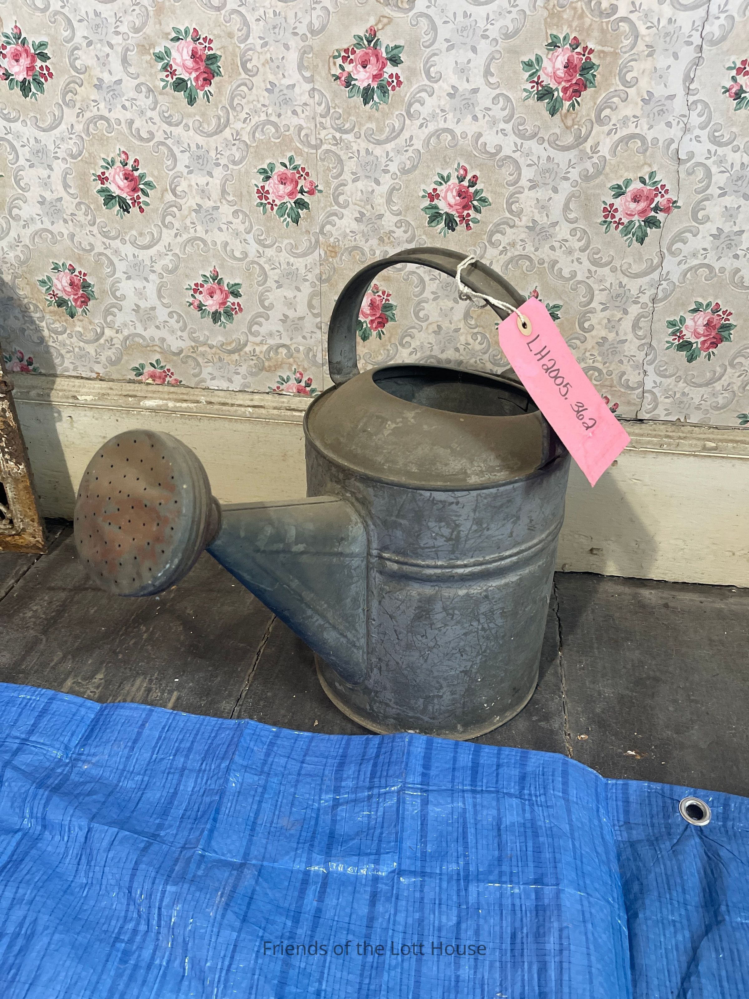 Galvanized metal watering can of cylindrical shape having strap handles and conical spout fitted with pierced headCollection