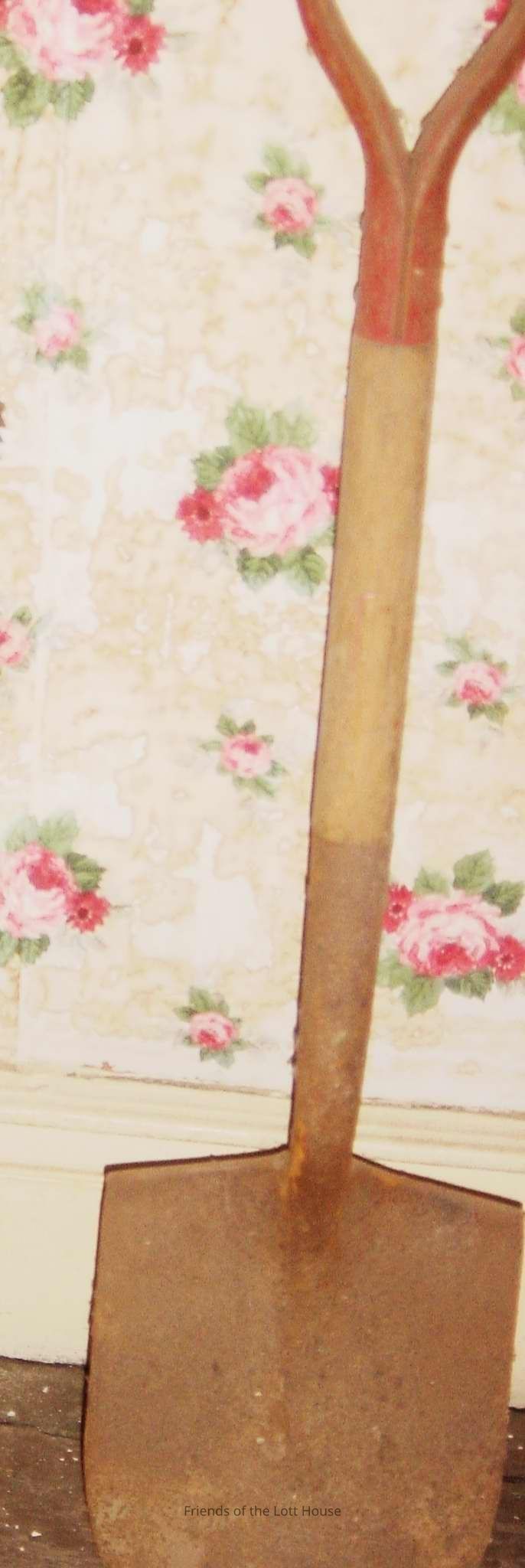 Metal shovel having spade shaped scoop on turned wood handle having red painted metal and wood graspCollection