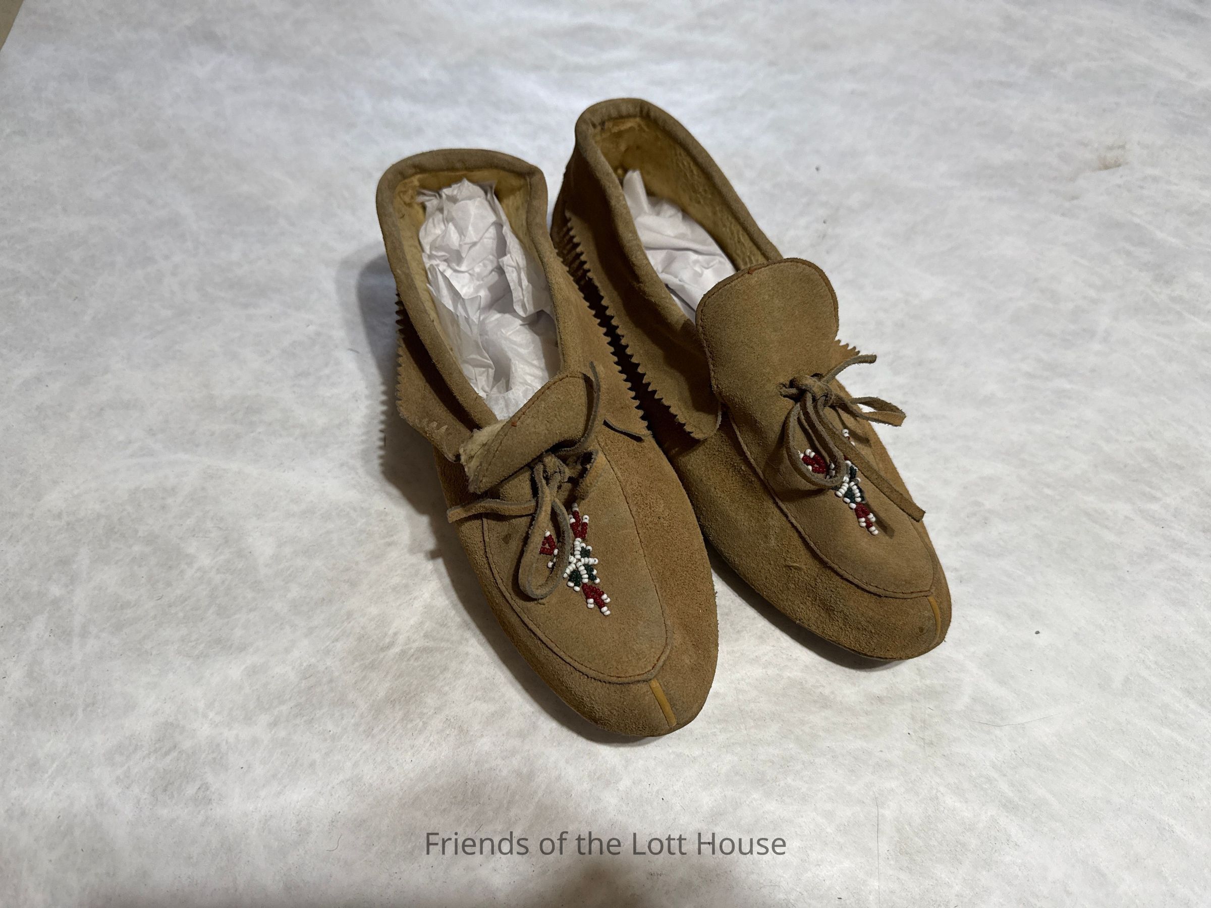 Pair of womens tan suede moccasins having colored beadwork (red, white, and green) decorationCollection