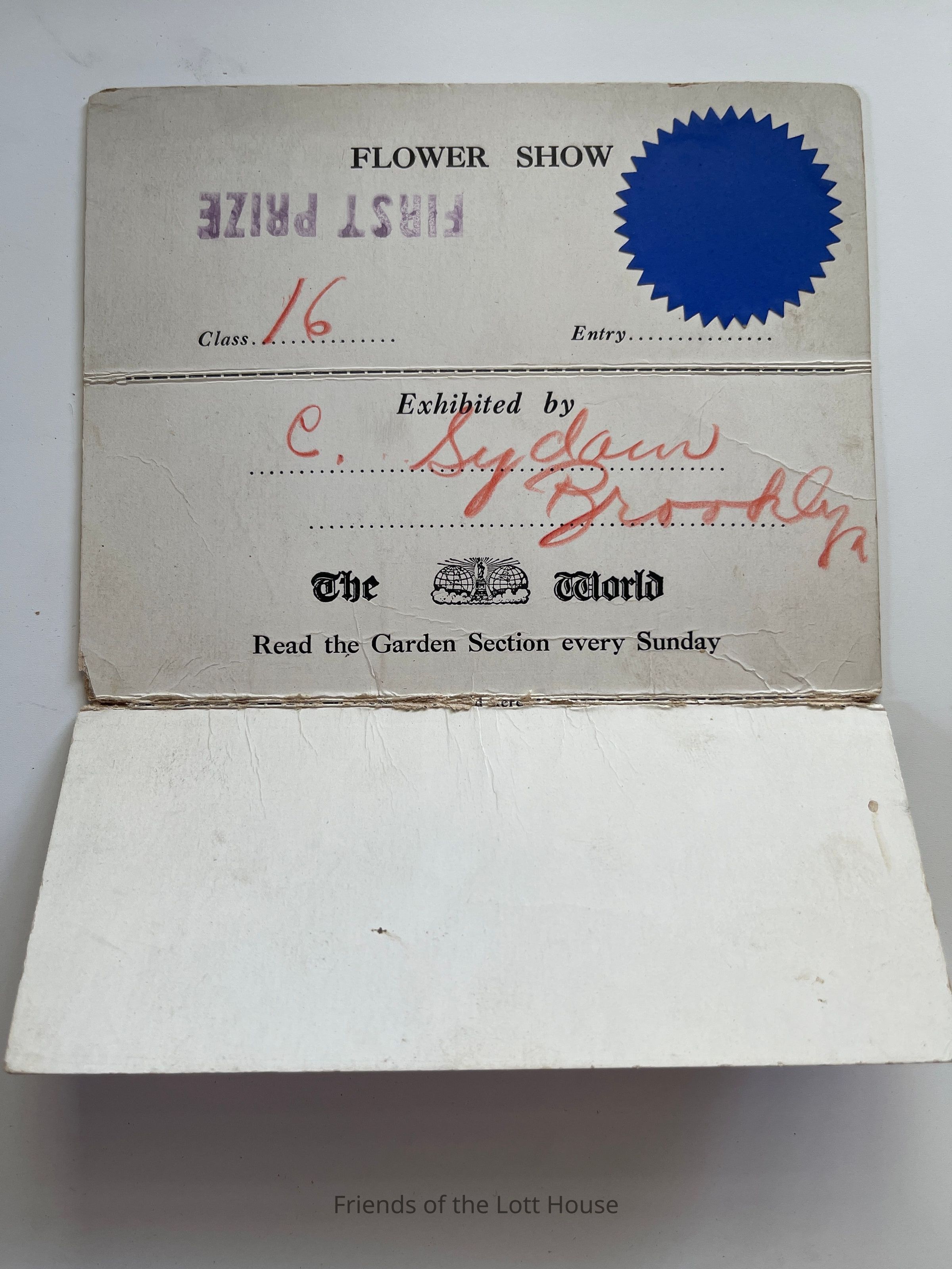Certificate for First Prize in Flower Show for E. Suydam The World Newspaper