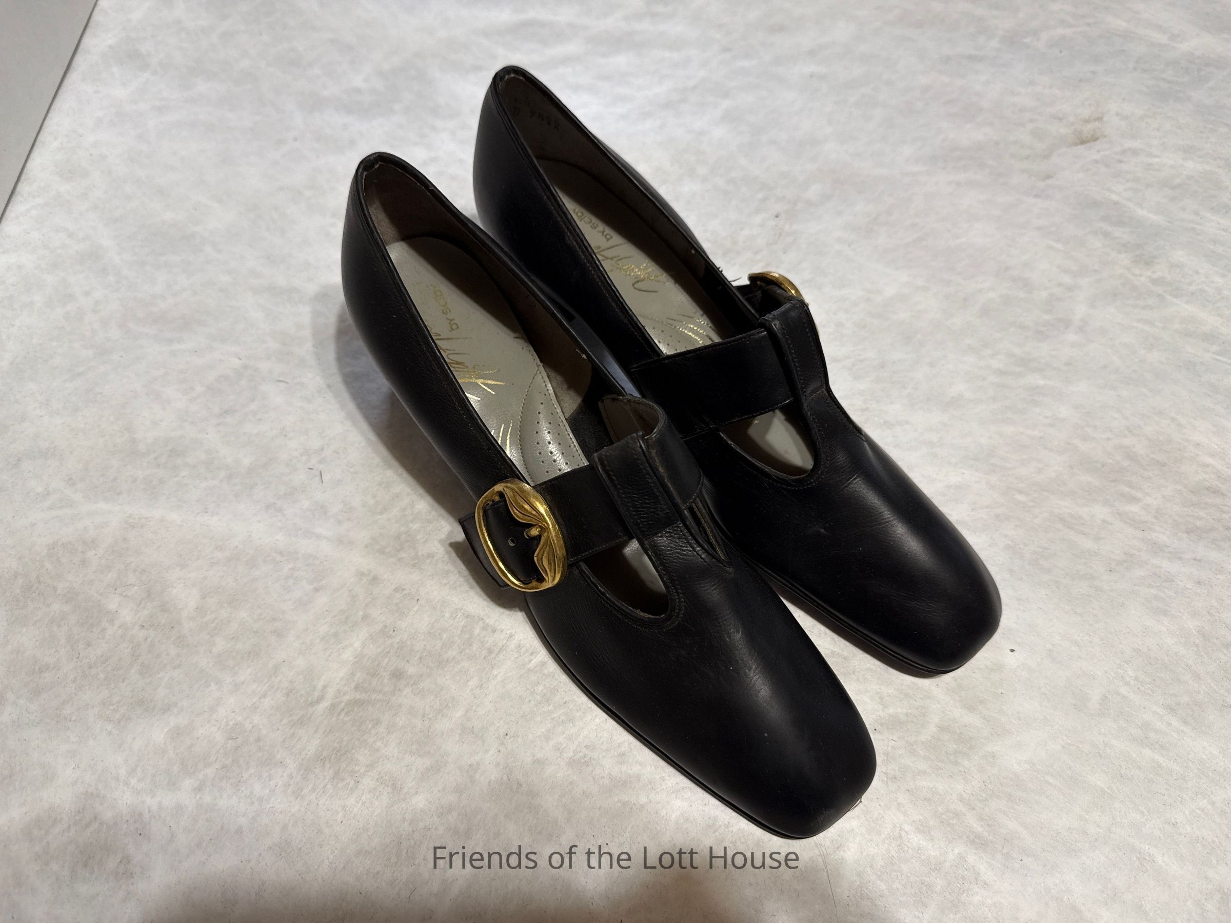 Pair of womens black leather shoes with buckle front and high heels. Brand: Fifth Avenue by SelbyCollection