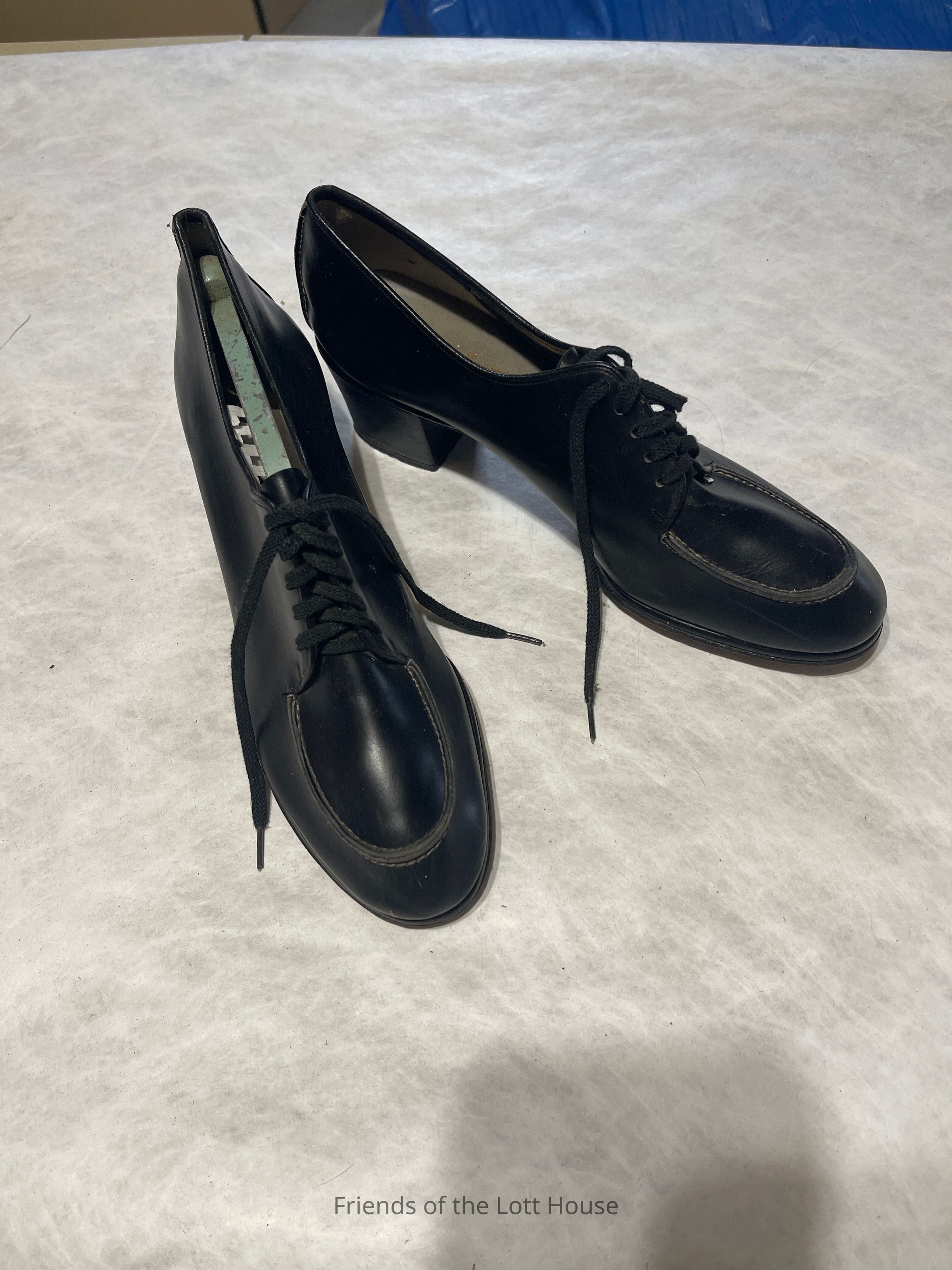 Pair of womens navy leather shoes with lace up front and high heels. Brand: Saks Fifth Avenue, Fenton Shoes. In a mismatched box that says Bellaire ShoesCollection