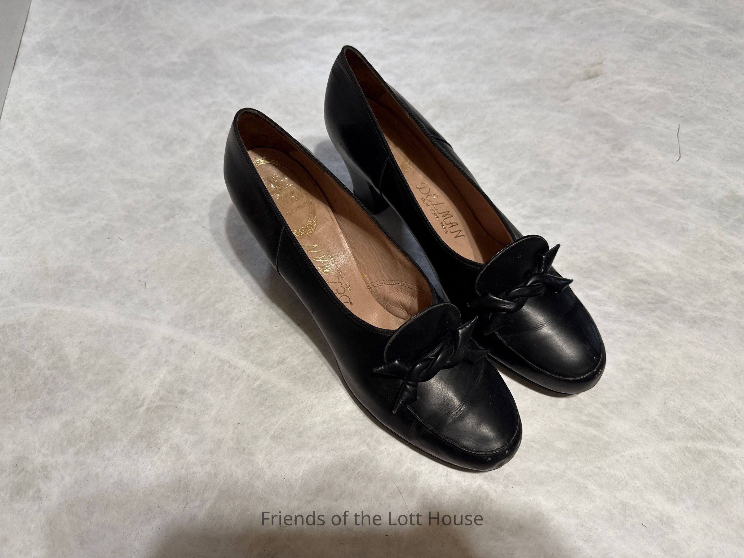 Pair of womens black leather pump with twist tie decoration on toe (same design as LH2005.414). Brand: Delmans, New YorkCollection