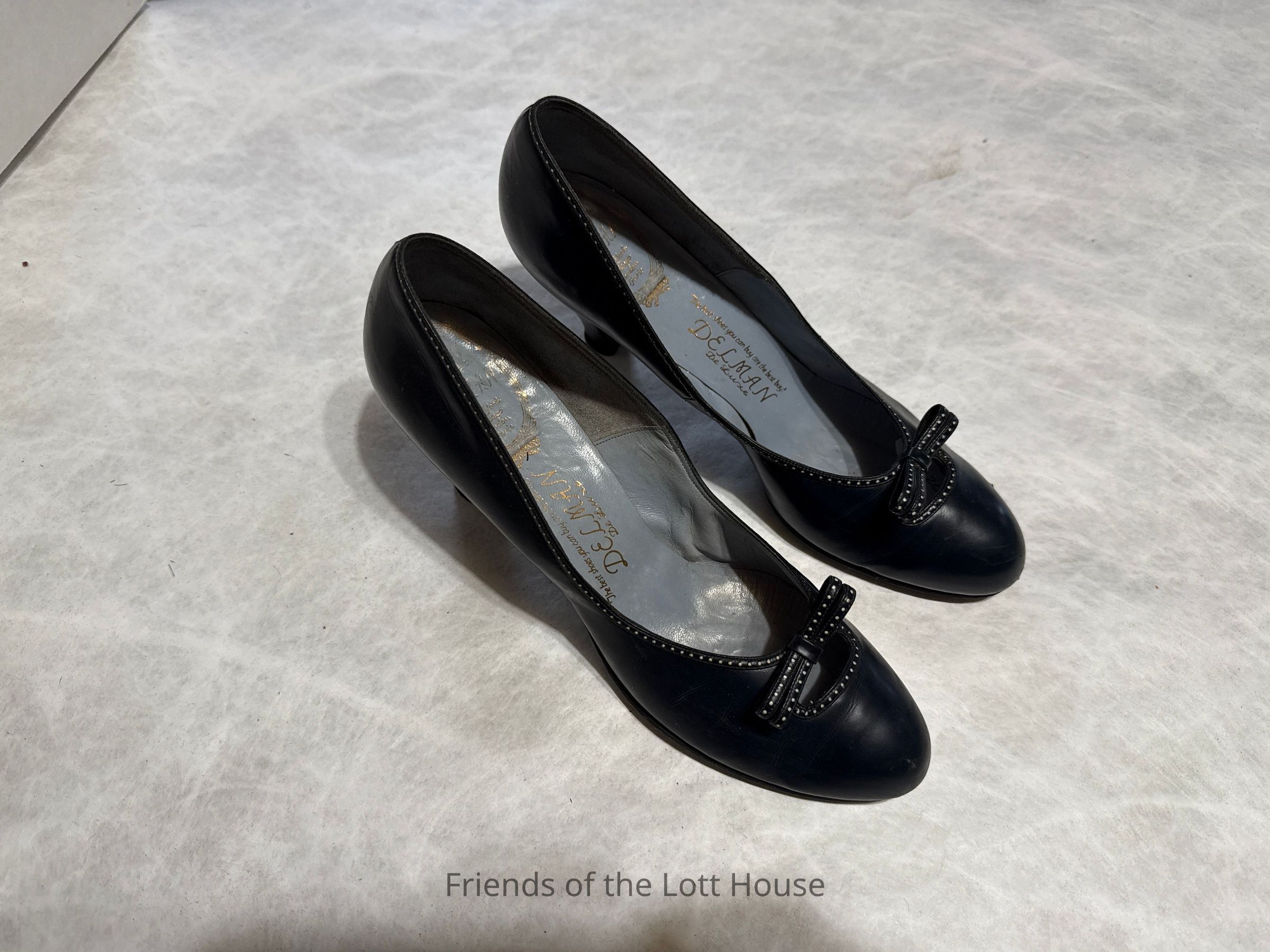 Pair of womens black leather pumps having bow at toe. Brand: Delmans, New YorkCollection
