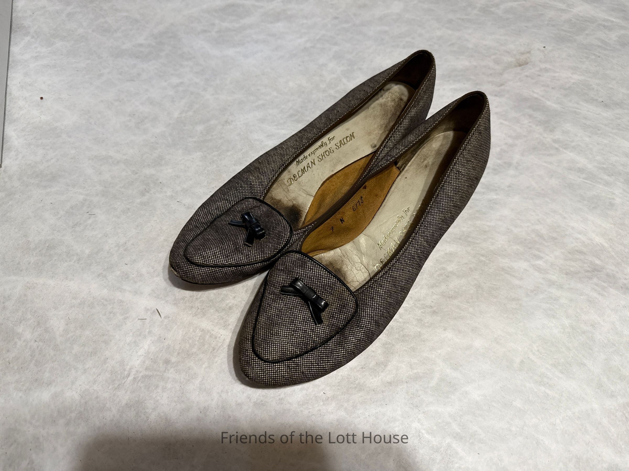 Pair of womens black and white pointed-toe cloth flats with patent leather bow on toe. Brand: Made expressly in Delmans Shoe SalonCollection