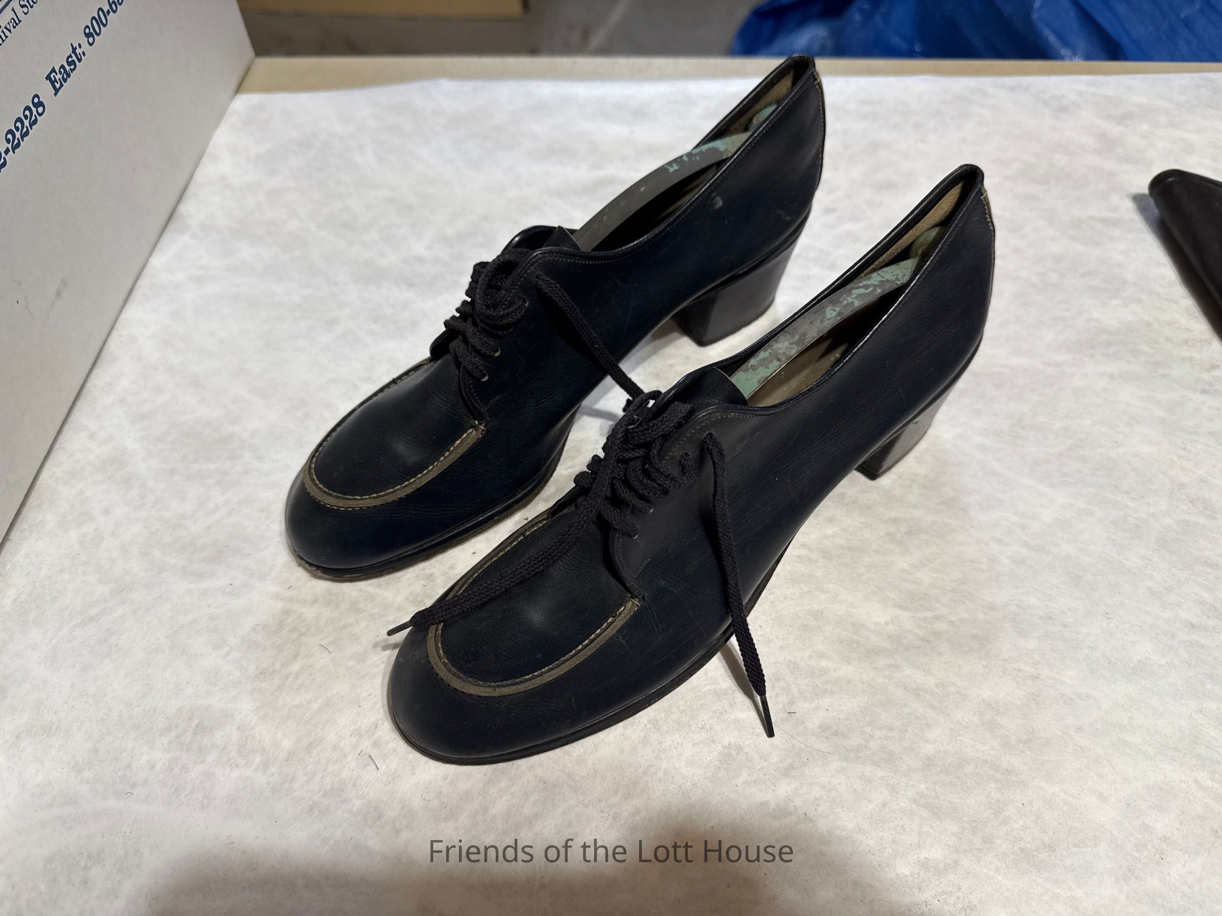 Pair of womens navy leather shoes with lace up fronts and block heel; with box. Brand: Saks Fifth Avenue, Fenton LastCollection