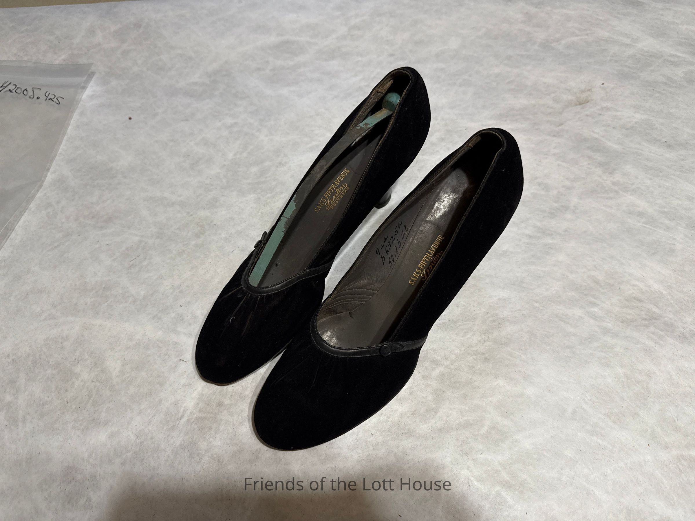 Pair of womens suede shoes with tucks on front and high heels. Brand: Saks Fifth Avenue, Fenton FootwearCollection