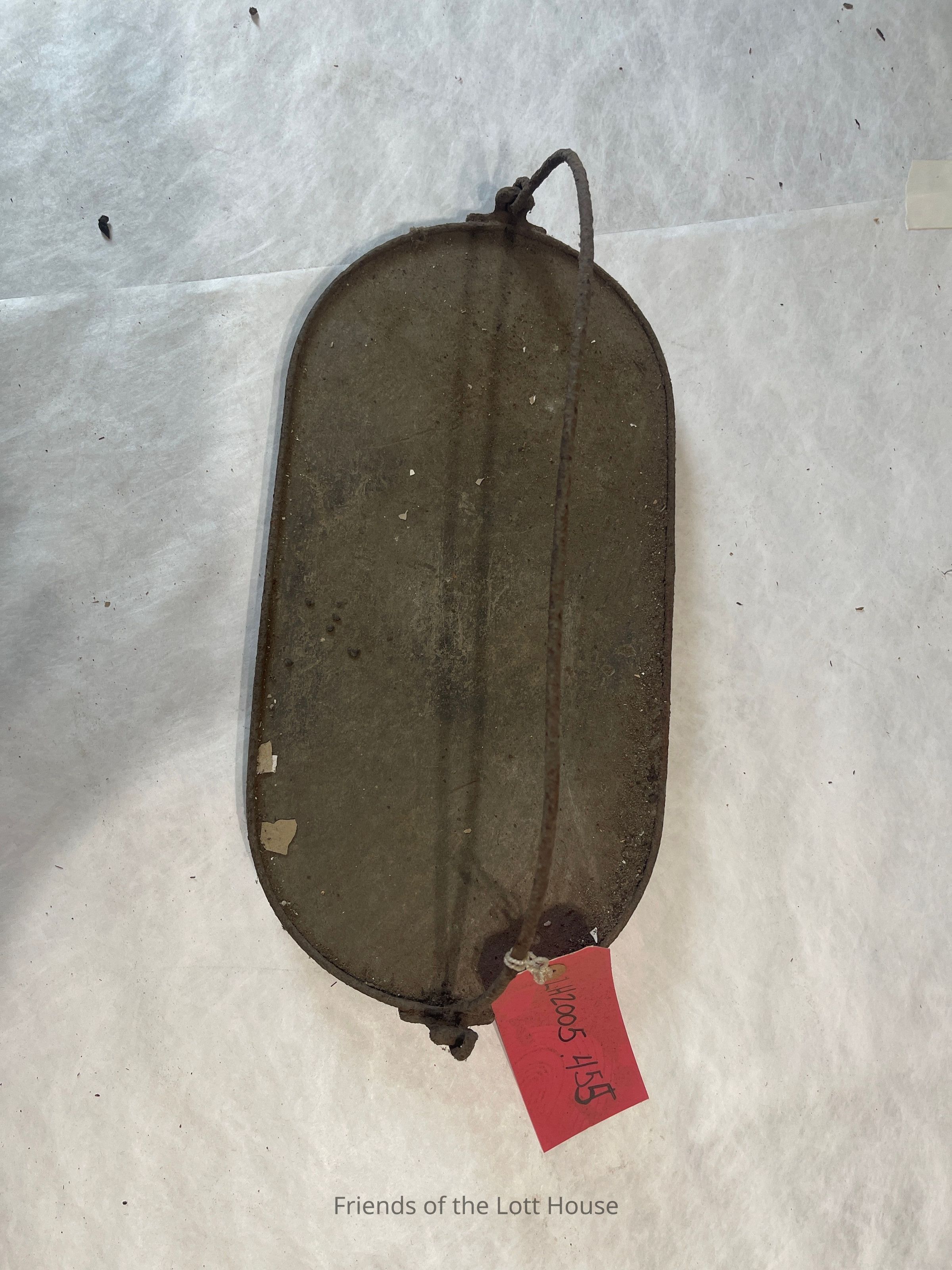 Oval shaped flat piece of slate or stone having metal band around perimeter with rolled metal handle or barCollection