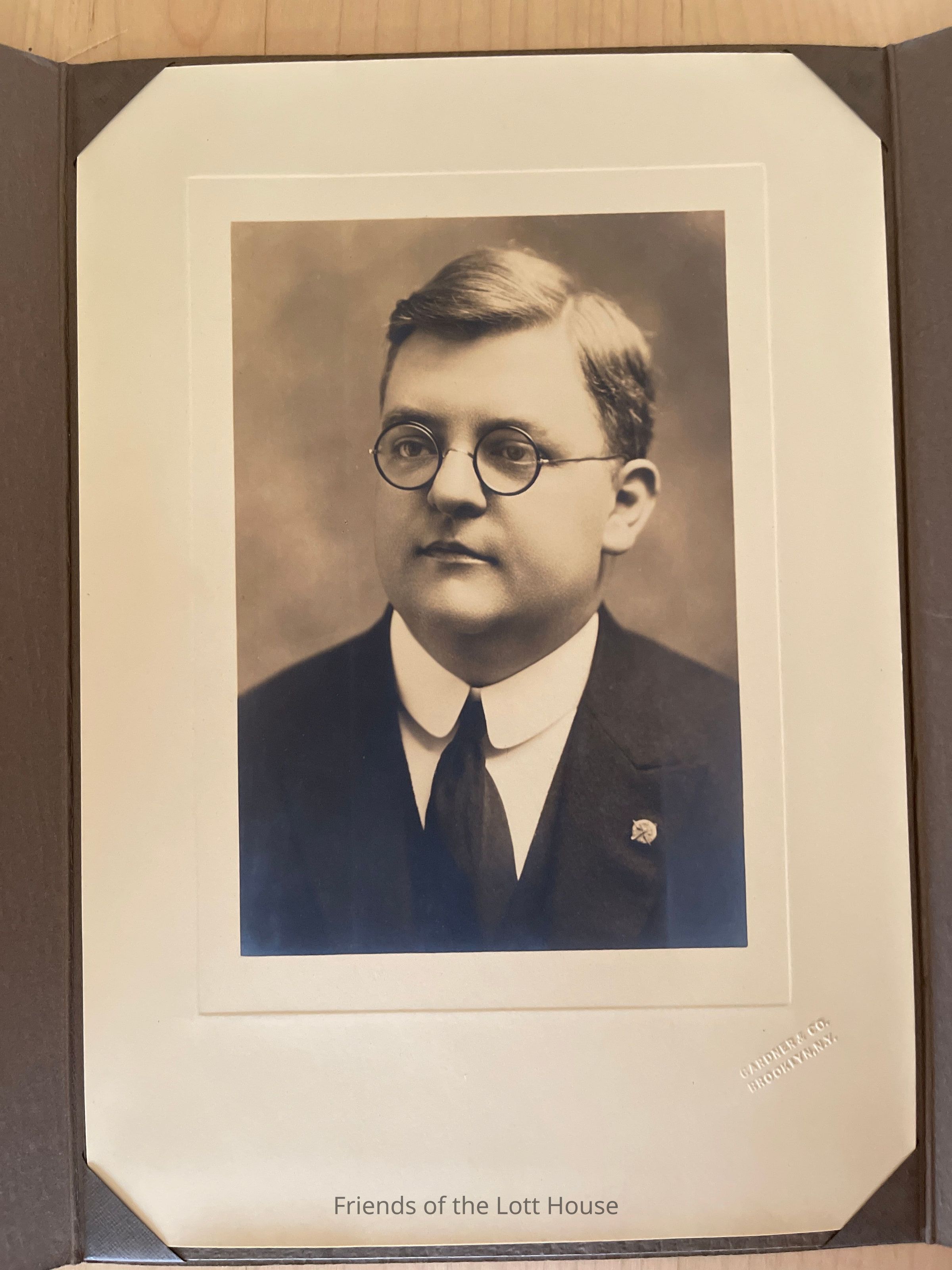 Photographic headshot of a man wearing glasses and wearing a suit. Charles A. Ditmas. In a brown folderCollection