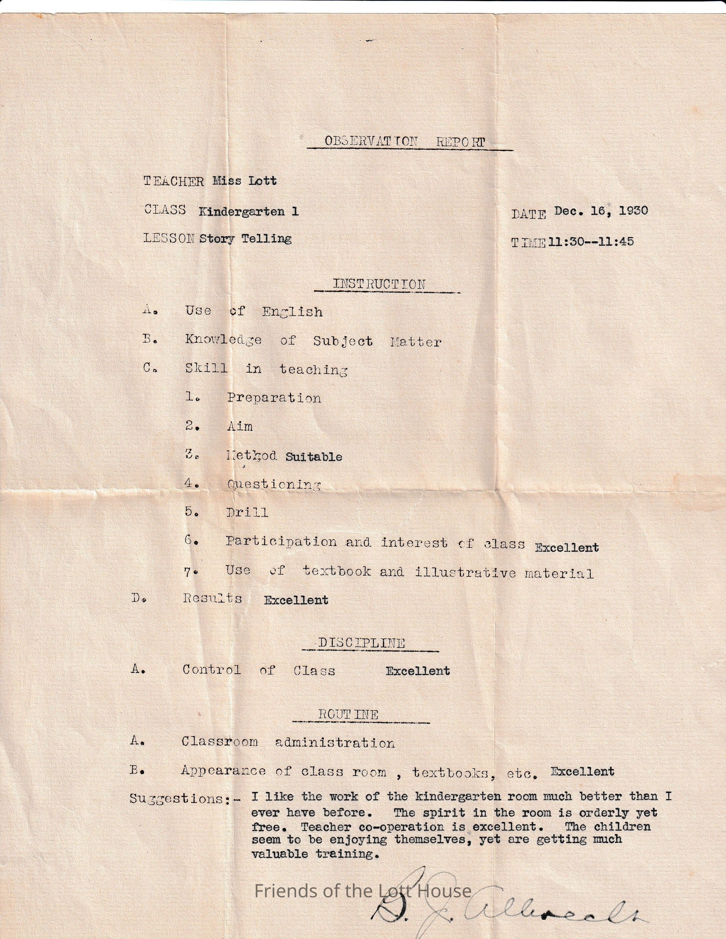 Observation Report, Miss Lott, Kindergarten 1, Story Telling Lesson, Dec. 16, 1930Collection