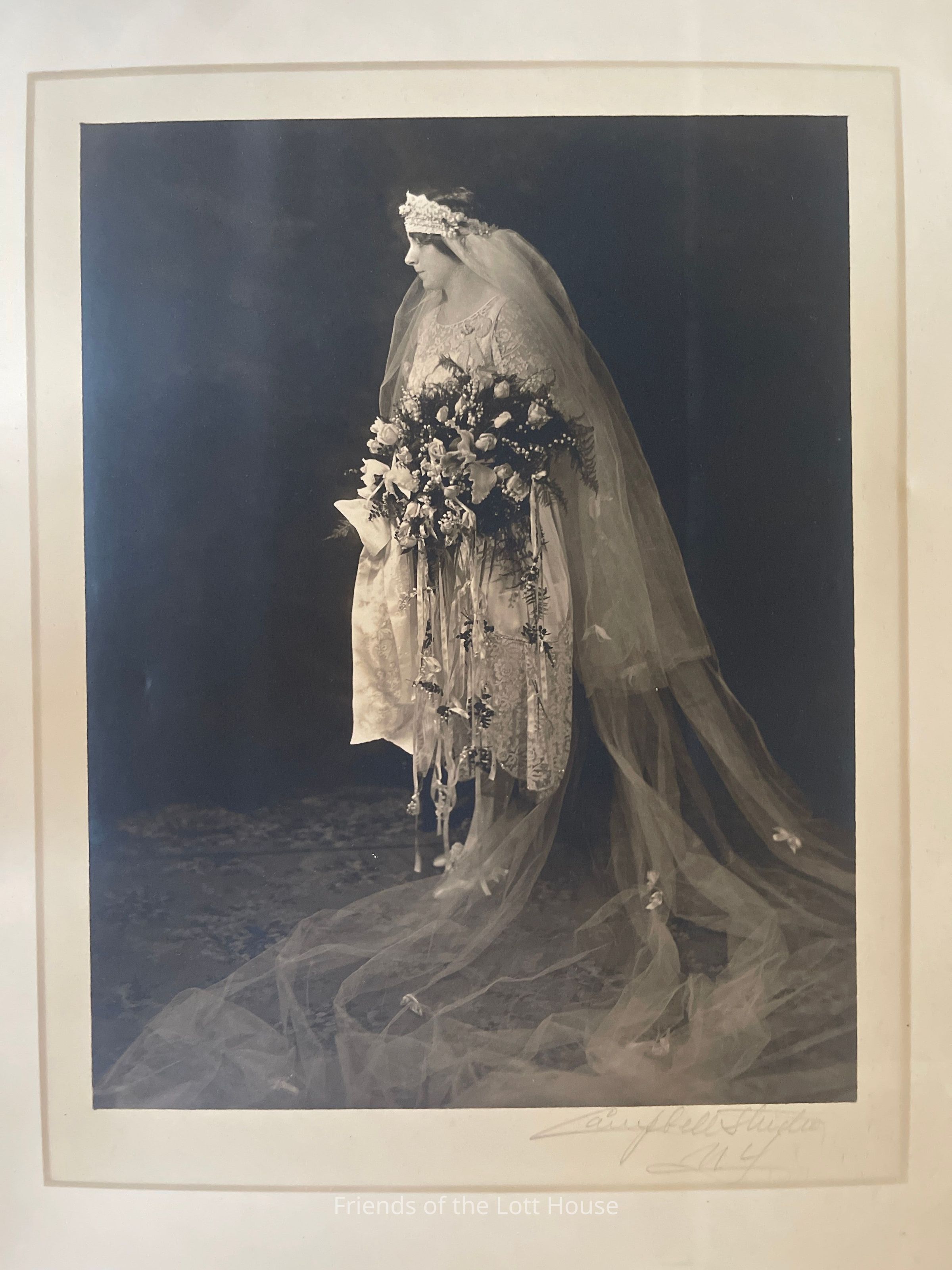 Folder which has inside a wedding photograph of a young woman with "Campbell Studios" written in script in pencil beneath it. "Campbell Studios" logo embossed on front cover.Collection